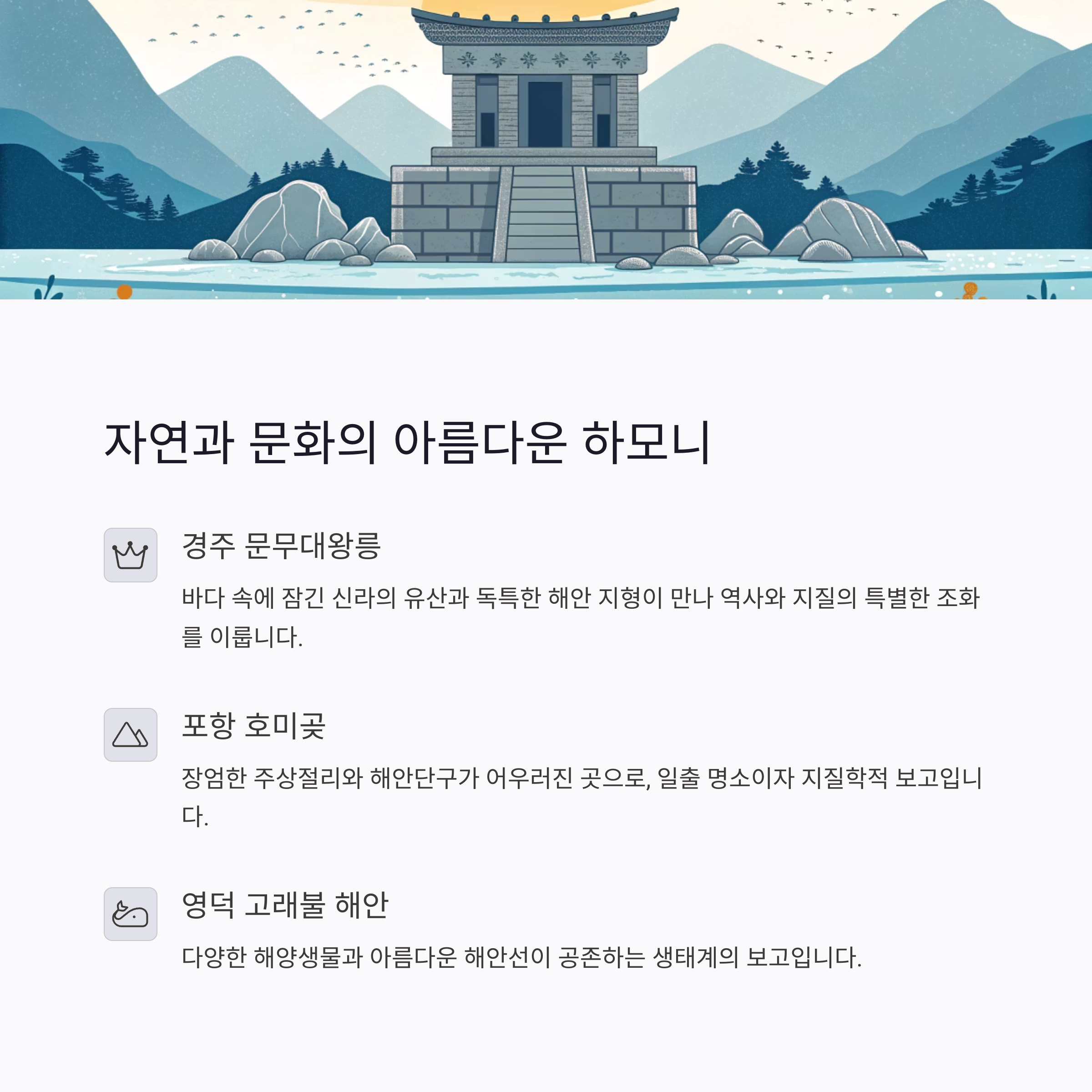 인증과 보존, 그리고 감동이 함께하는 경북 동해안 세계지질공원. 이곳은 단순한 관광이 아닌, 지구의 역사와 우리의 미래가 만나는 자리입니다. 화려한 조명 대신 암석과 바람, 파도와 주상절리가 들려주는 이야기를 따라 걸어보세요. 가족과 함께, 아이들과 함께 자연을 배우는 여행, 이번 주말엔 동해안에서 시작해보세요!