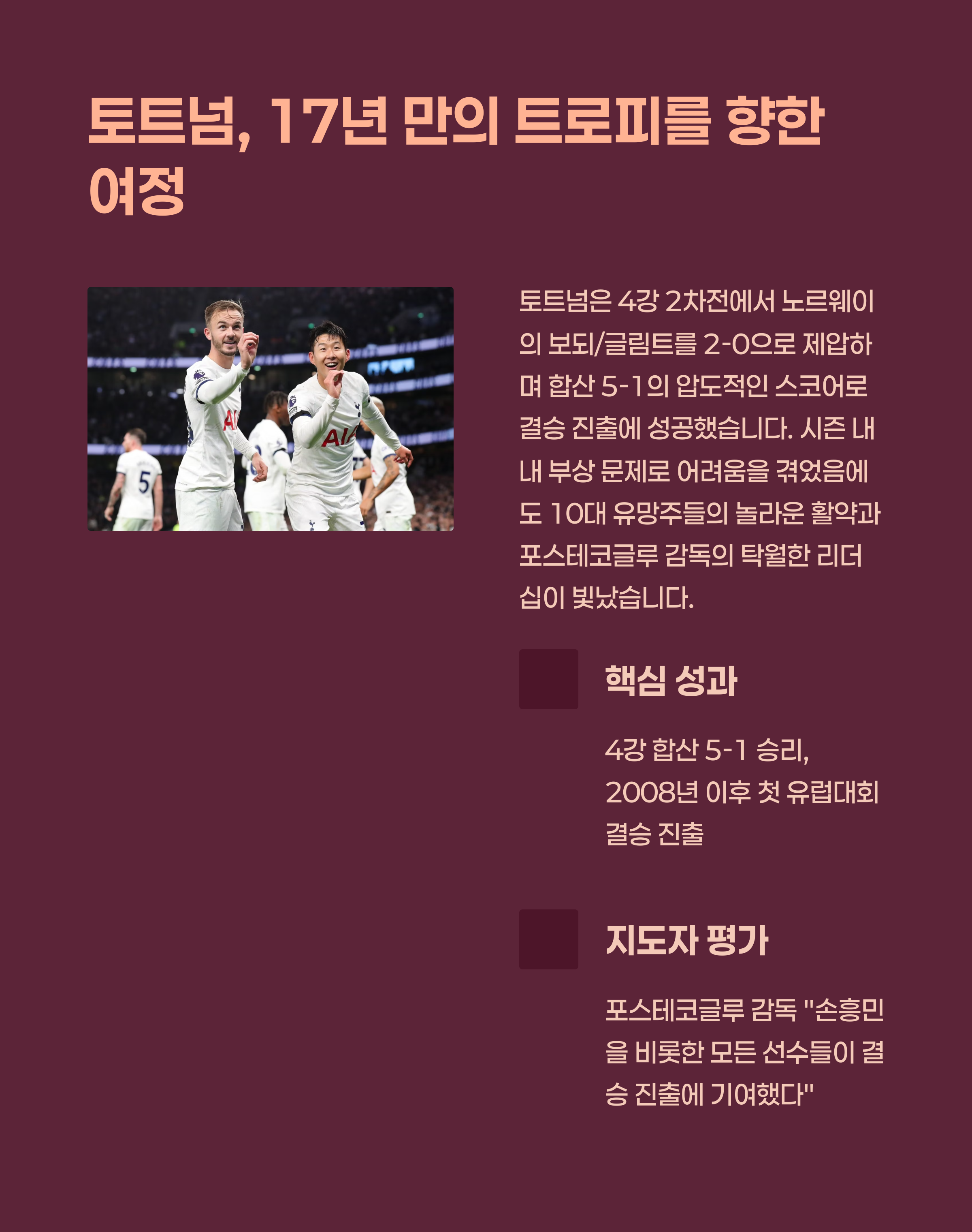 토트넘 홋스퍼는 준결승에서 노르웨이의 보되/글림트를 상대로 1, 2차전 합계 5-1이라는 압도적인 승리를 거두고 결승 진출에 성공했습니다. 특히 손흥민은 주장 완장을 차고 중심에서 팀을 이끌었으며, 솔란케와 포로의 연속 득점으로 결승 진출을 확정지었습니다. 손흥민 개인으로서는 2008년 리그컵 이후 구단의 17년 무관을 끊고 첫 우승 트로피를 들어올릴 수 있는 절호의 기회입니다.