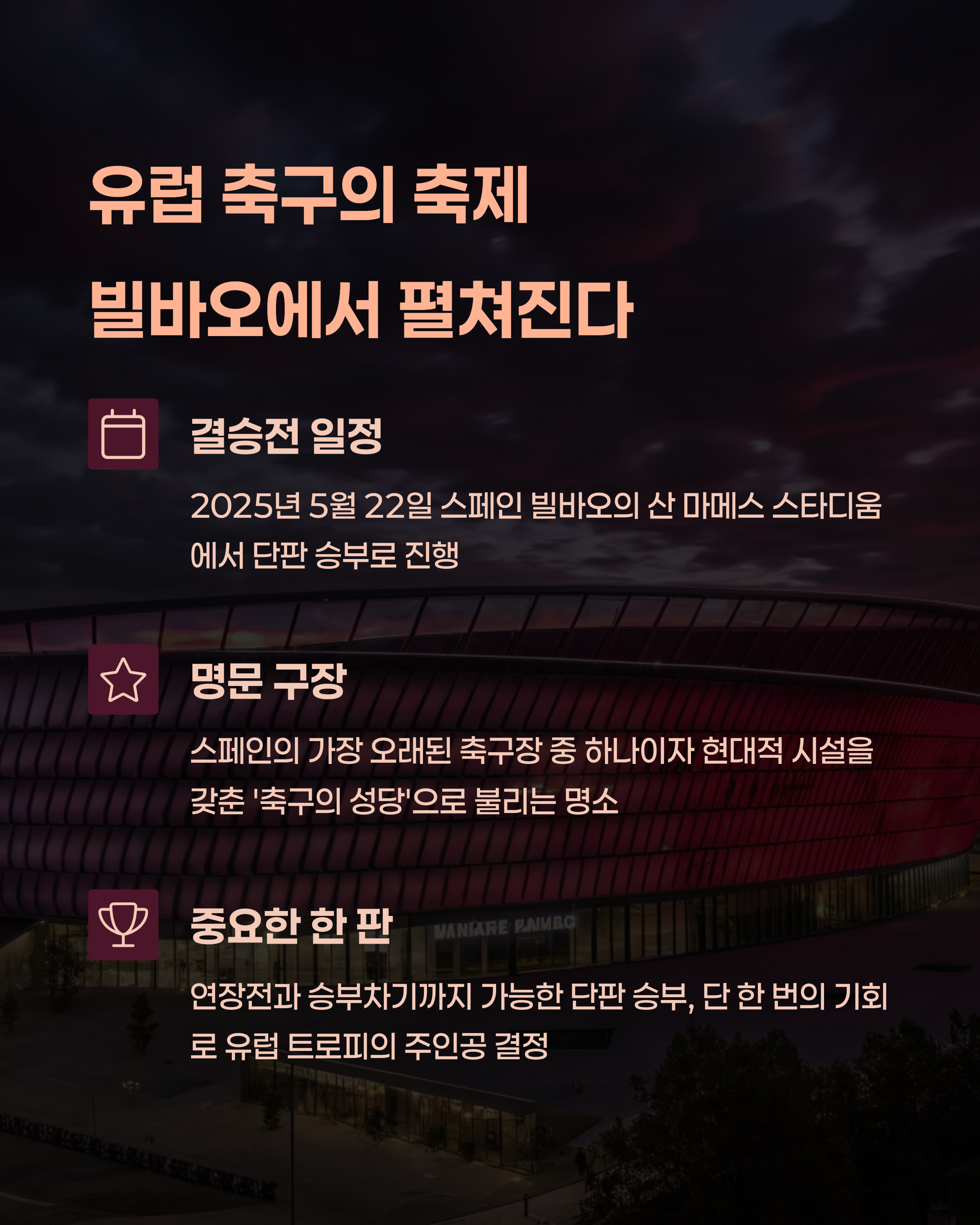 2025 UEFA 유로파리그 결승은 5월 22일(목, 한국시간)에 스페인 빌바오의 산 마메스 스타디움에서 단판 승부로 열립니다. 경기 방식은 90분 정규 시간에 승부가 나지 않으면 연장전, 그래도 무승부일 경우 승부차기로 이어지며, 승자는 2025-2026 UEFA 챔피언스리그 본선 자동 진출권을 획득하게 됩니다. EPL 명문 두 팀이 유로파 결승에서 격돌하는 건 상당히 드문 일이며, 이번 매치는 그만큼 상징성과 관심도가 높습니다.