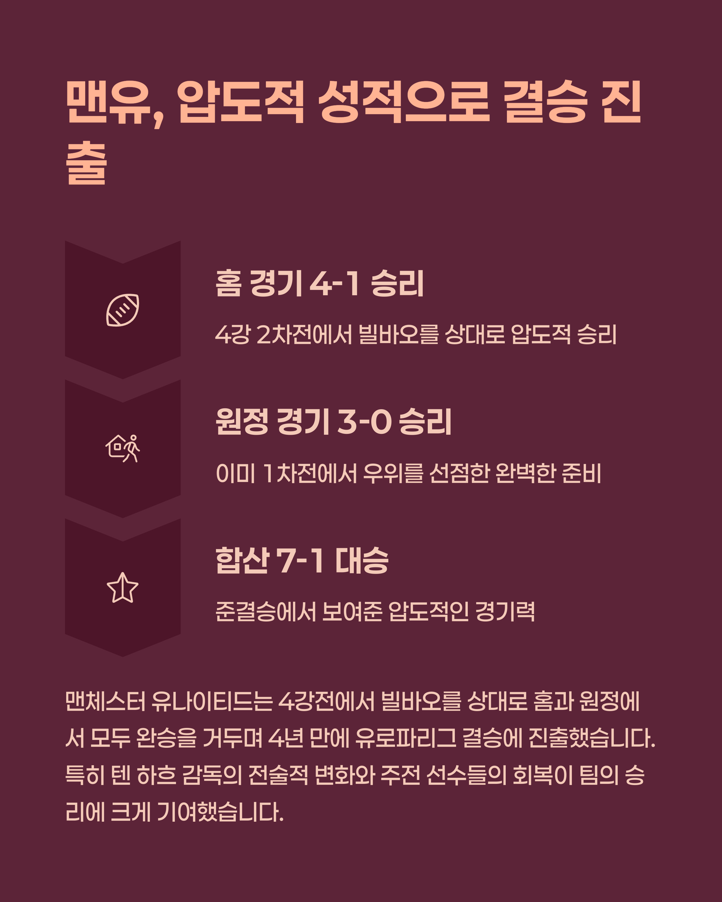 맨체스터 유나이티드는 준결승에서 스페인 강호 빌바오를 상대로 1·2차전 합계 7-1이라는 압도적인 스코어로 결승행을 확정지었습니다. 특히 메이슨 마운트, 카세미루, 호일룬의 연속 득점과 아모림 감독의 전술 리더십이 돋보였는데요. 맨유는 2017년 유로파리그 우승 이후 8년 만에 다시 유럽대회 트로피를 노리고 있습니다. 포르투갈 출신의 아모림 감독은 이번 시즌을 통해 맨유 재건의 중심축으로 주목받고 있죠.