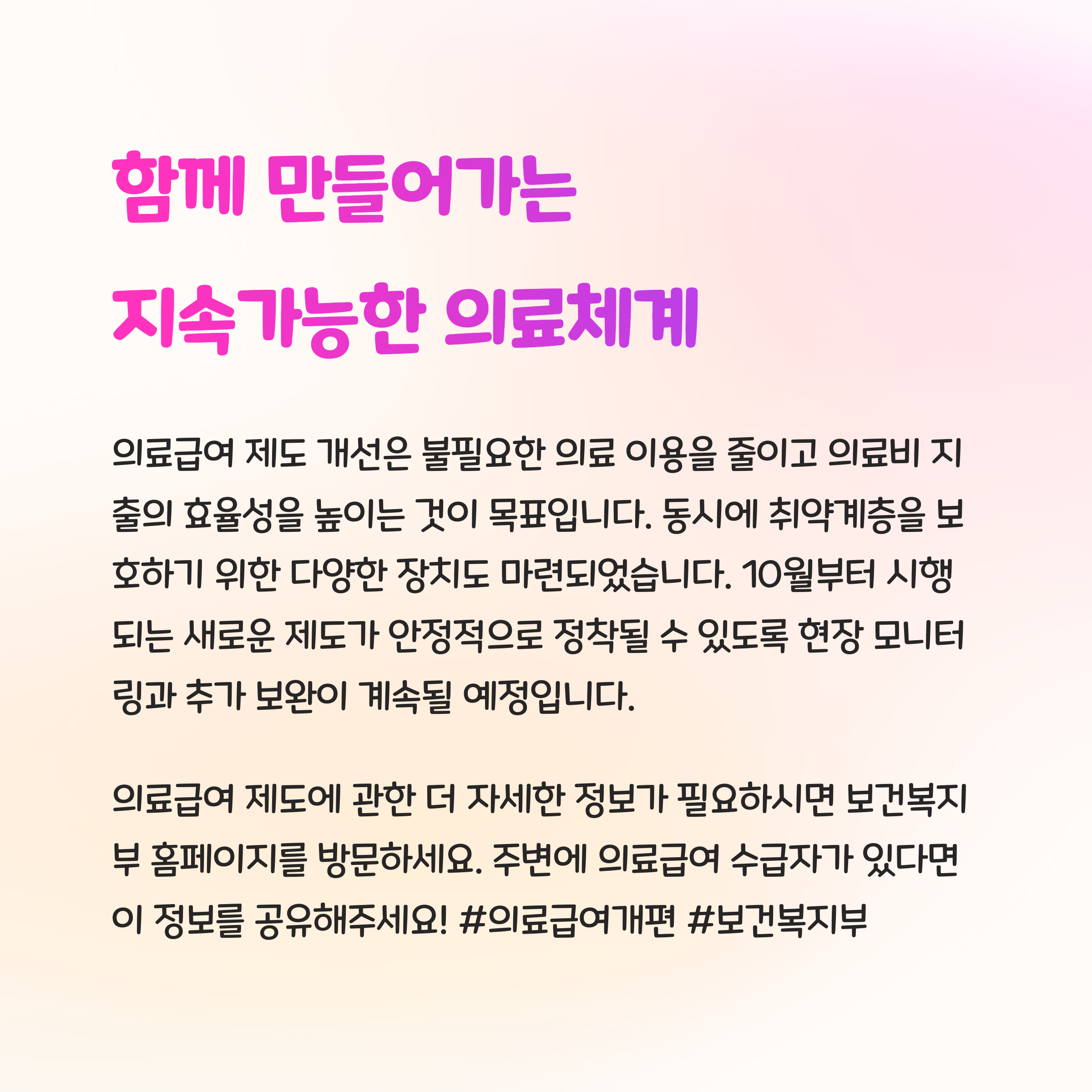이번 의료급여 제도 개편은 단순히 부담을 늘리는 조치가 아니라, 필요한 진료를 효율적으로 이용하고, 의료자원을 아끼기 위한 변화라고 생각해요. 특히 외래를 자주 이용하는 분들은 갑작스러운 부담을 피하기 위해 지금부터 방문 계획을 조금씩 조정해보는 게 중요하겠죠? 건강관리는 꾸준히, 병원 방문은 꼭 필요한 경우에만! 새로운 제도에 대비해 슬기롭게 준비하는 우리가 되었으면 합니다 :)