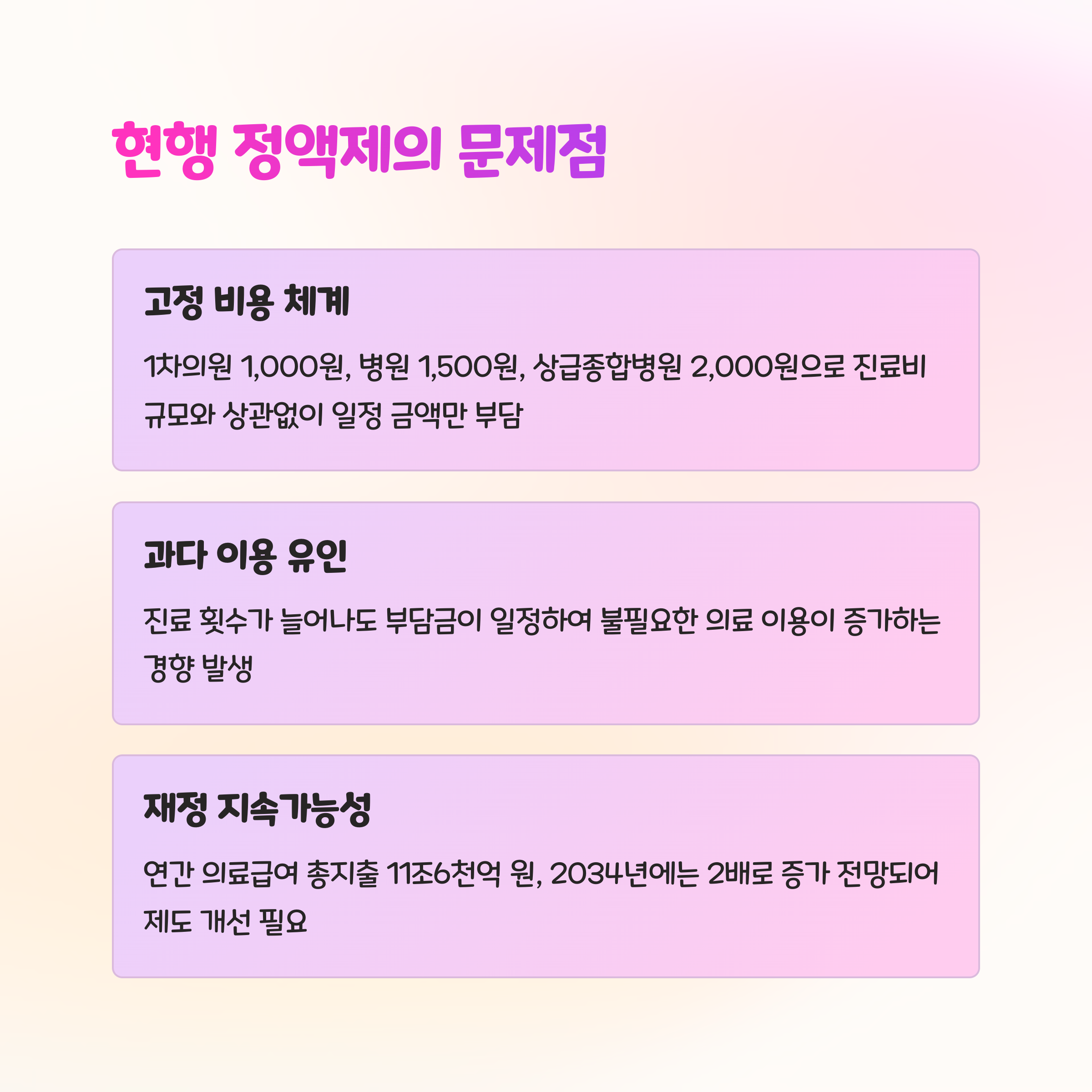 | 본인부담 방식 | 정액(1,000~2,000원) | 정률(4~8%) |