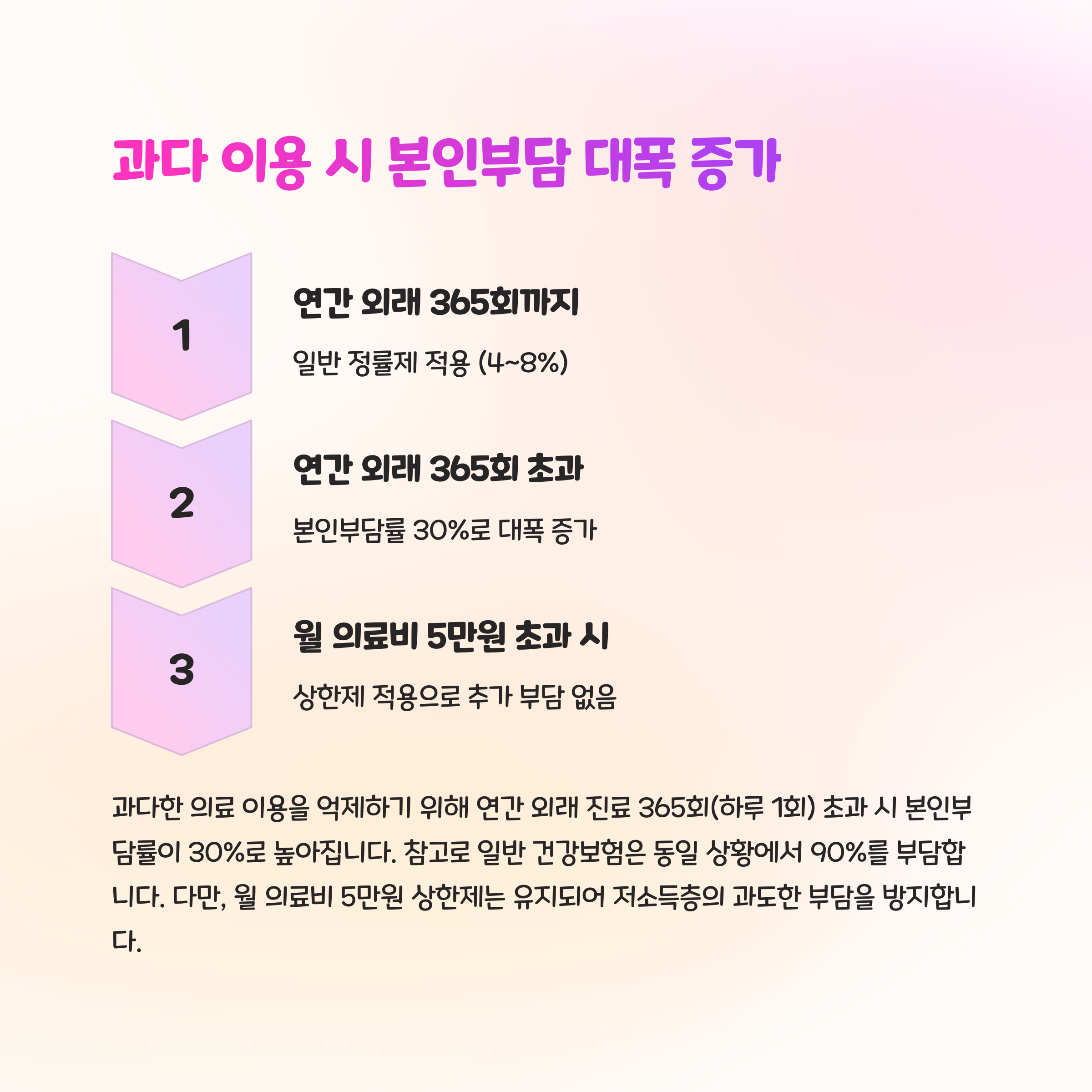 | 연간 외래 진료 | 제한 없음 | 365회 초과 시 본인부담 30% |