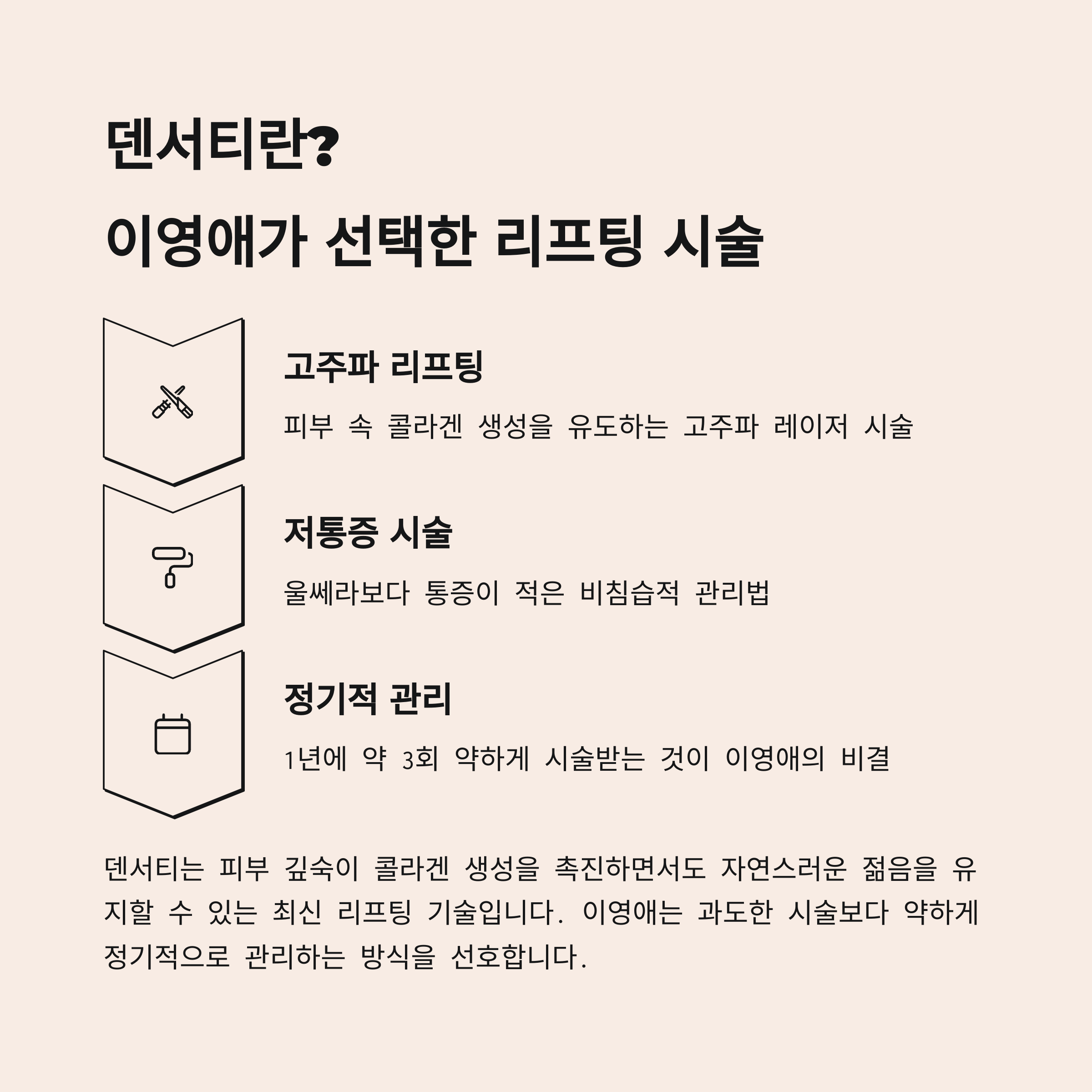 덴서티는 단발성 시술보다는 연속적이고 규칙적인 관리로 효과를 보는 타입의 리프팅입니다.