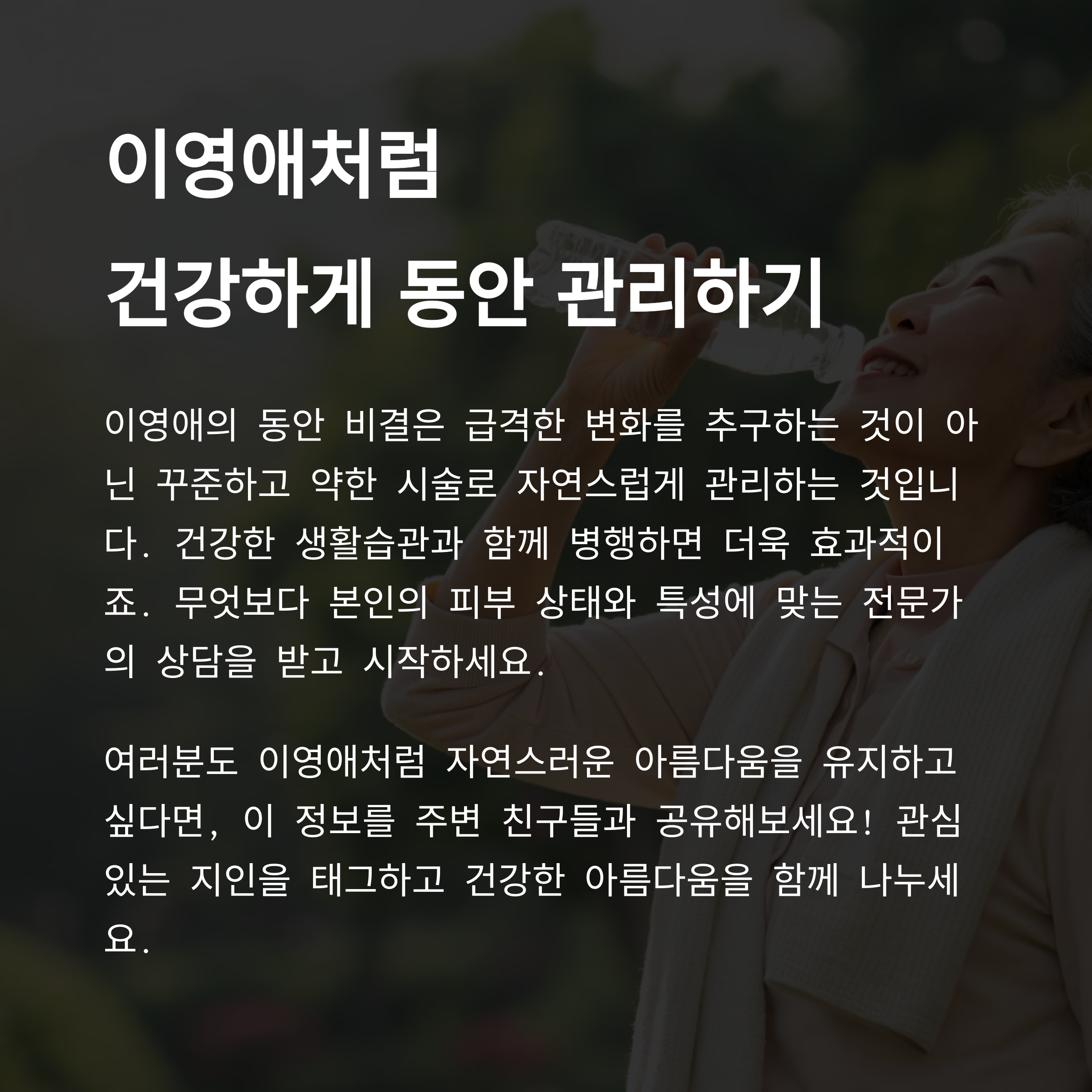 프로그램에서 홍진경은 “연극 이야기할 때보다 덴서티 말할 때 훨씬 열정적이다”라고 농담을 던졌지만, 그만큼 이영애가 직접 경험하고 효과를 본 시술이라는 점이 느껴졌습니다. 자신만 알고 싶을 법도 한 동안 비결을 카메라 앞에서 설명하는 모습에서 덴서티에 대한 만족도와 신뢰가 얼마나 높은지를 엿볼 수 있었죠. 무리한 시술 없이 천천히 피부를 관리한다는 점에서 자연주의적 성향과도 맞닿아 있습니다.