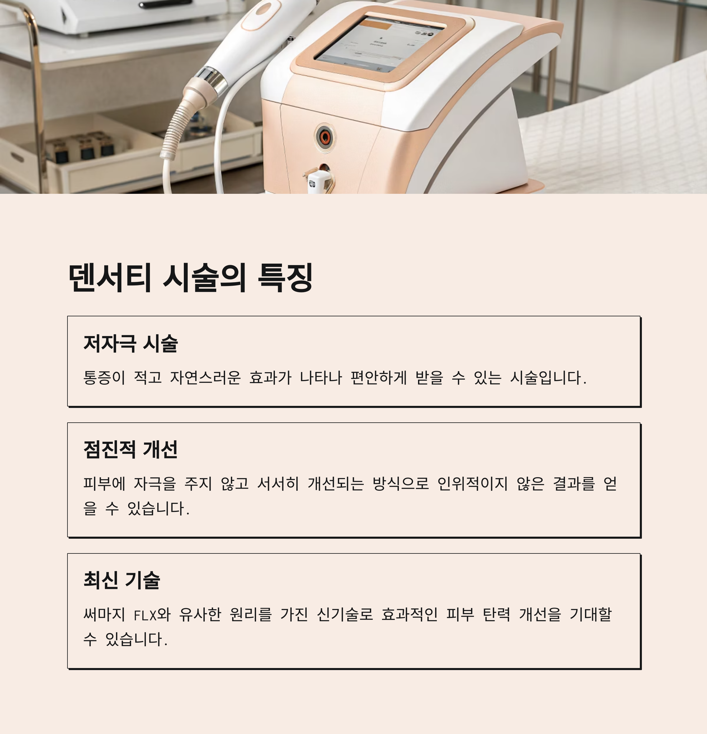 덴서티는 아직 모든 피부과에서 보편화된 시술은 아닙니다. 특히 장비의 종류나 세기 조절 가능 여부에 따라 효과와 만족도가 달라질 수 있어요. 시술 전 병원에 해당 장비가 있는지, 어느 버전인지, 숙련된 의료진이 시술하는지 확인이 필요합니다. 또한 피부가 얇거나 민감한 사람은 테스트를 받고 진행하는 것도 안전한 선택입니다.