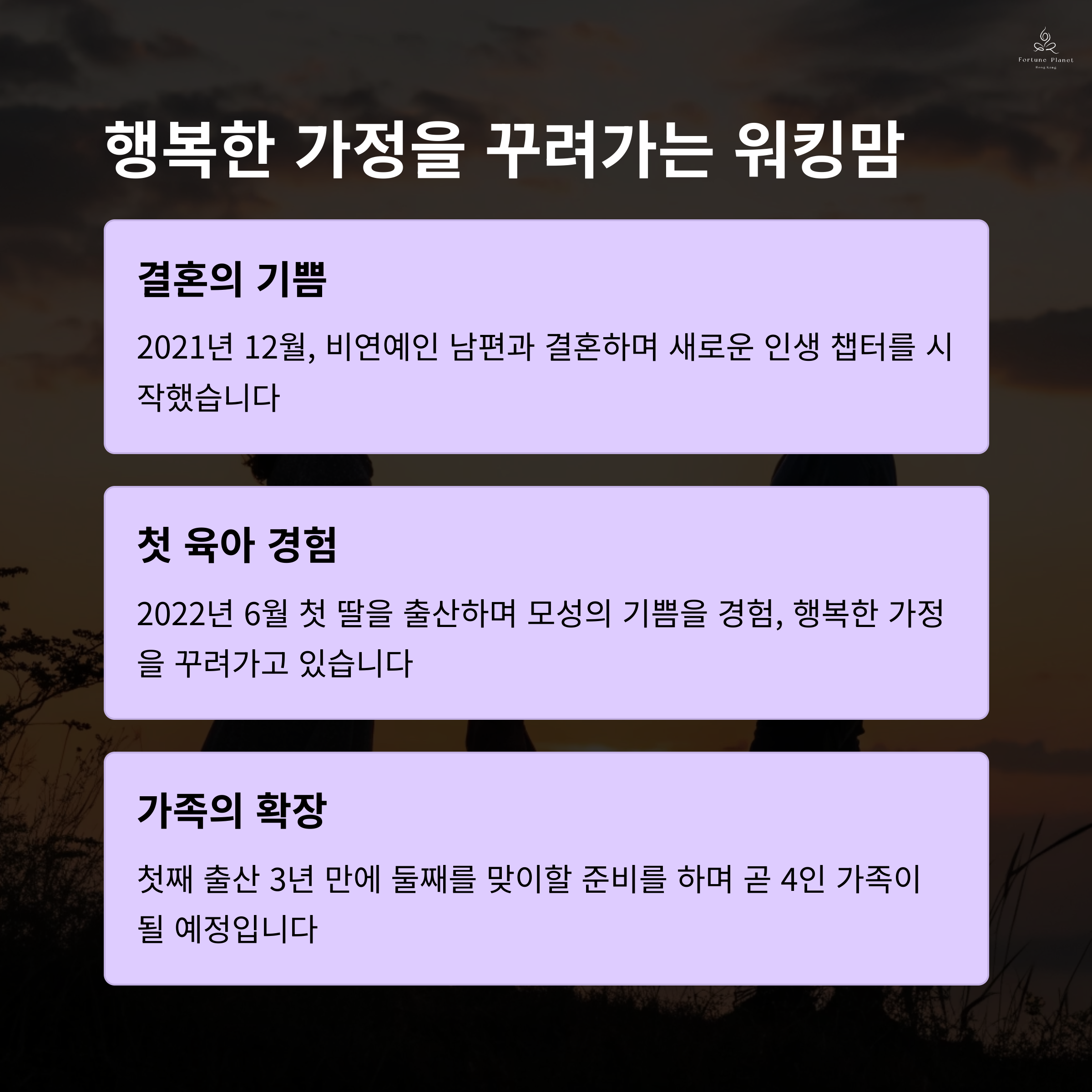 - 2021년 비연예인과 결혼, 2022년 첫째 딸 출산