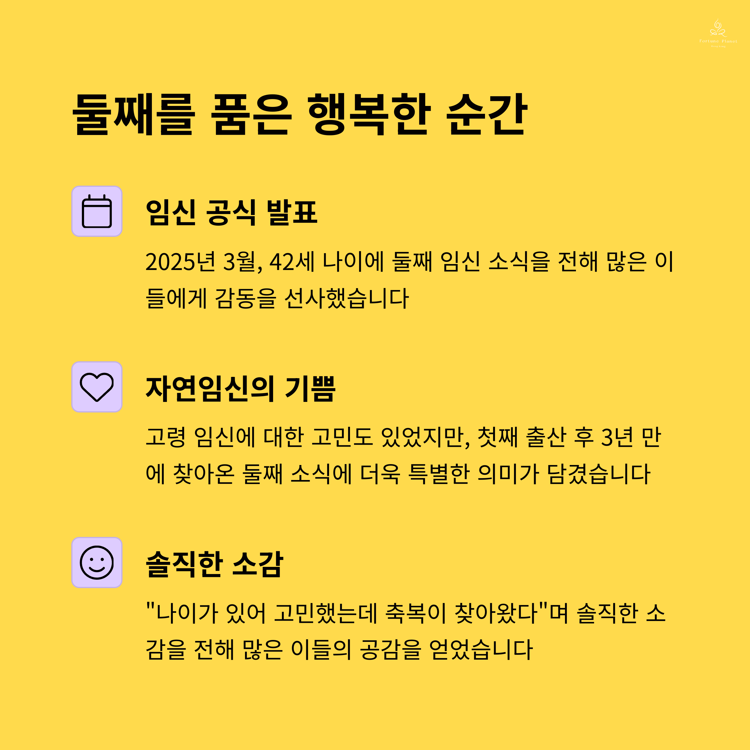 - 2025년 3월, 둘째 임신 발표…현재 순산 준비 중
