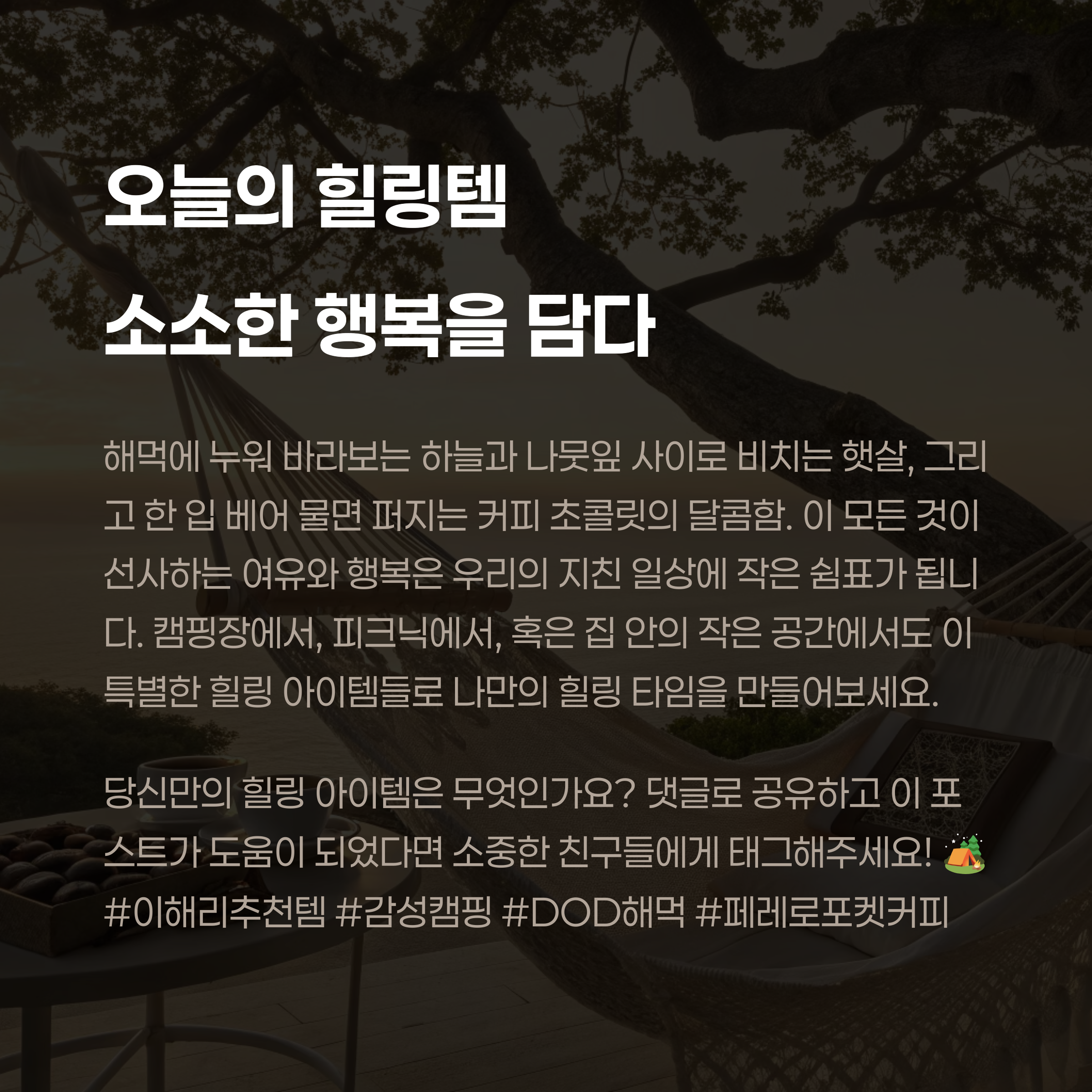 자연 속에서의 여유, 당신은 마지막으로 언제 느껴보셨나요? 바쁜 일상 속에서도 잠깐의 휴식은 꼭 필요합니다. 이해리처럼 작고 조용한 쉼을 원한다면, 감성 해먹과 따뜻한 초콜릿 커피 한 잔으로 그 순간을 만들어보세요. 꼭 캠핑장이 아니어도 괜찮아요. 마당, 베란다, 혹은 공원 한 켠에서도 충분히 누릴 수 있는 감성입니다.
