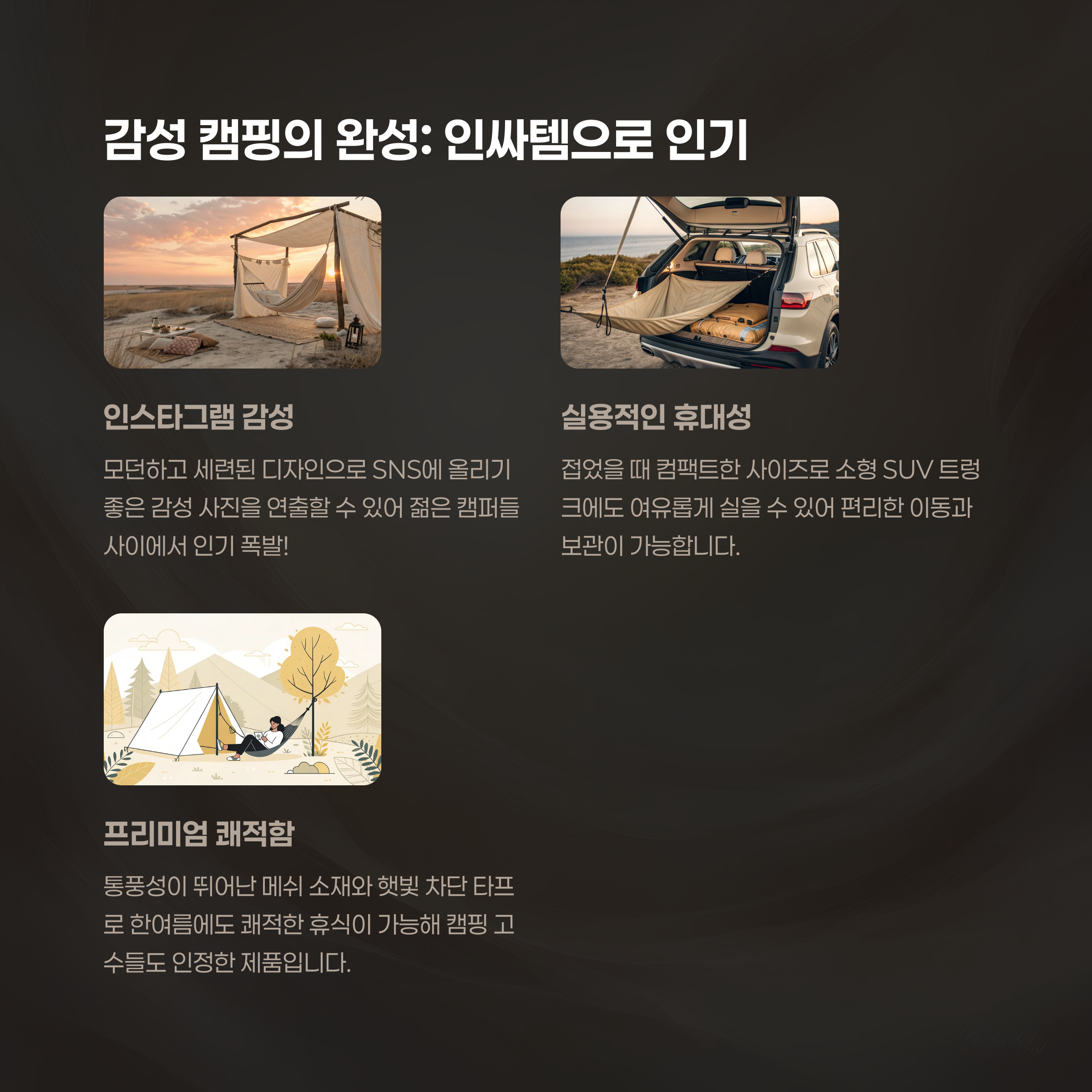 그늘과 쉼터, 캠핑 공간까지 한 번에 구성할 수 있는 멀티 아이템