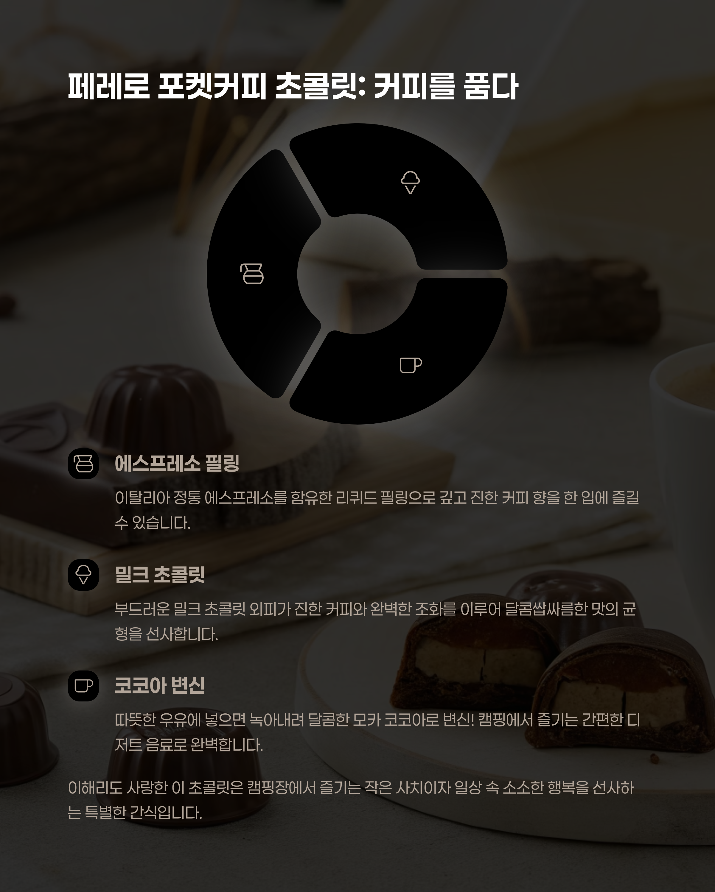 | 페레로 포켓 커피 | 밀크 초콜릿 + 액상 에스프레소 | 3개 기준 에스프레소 한 잔 | 그냥 먹거나, 따뜻한 우유에 녹여 마시기 |
