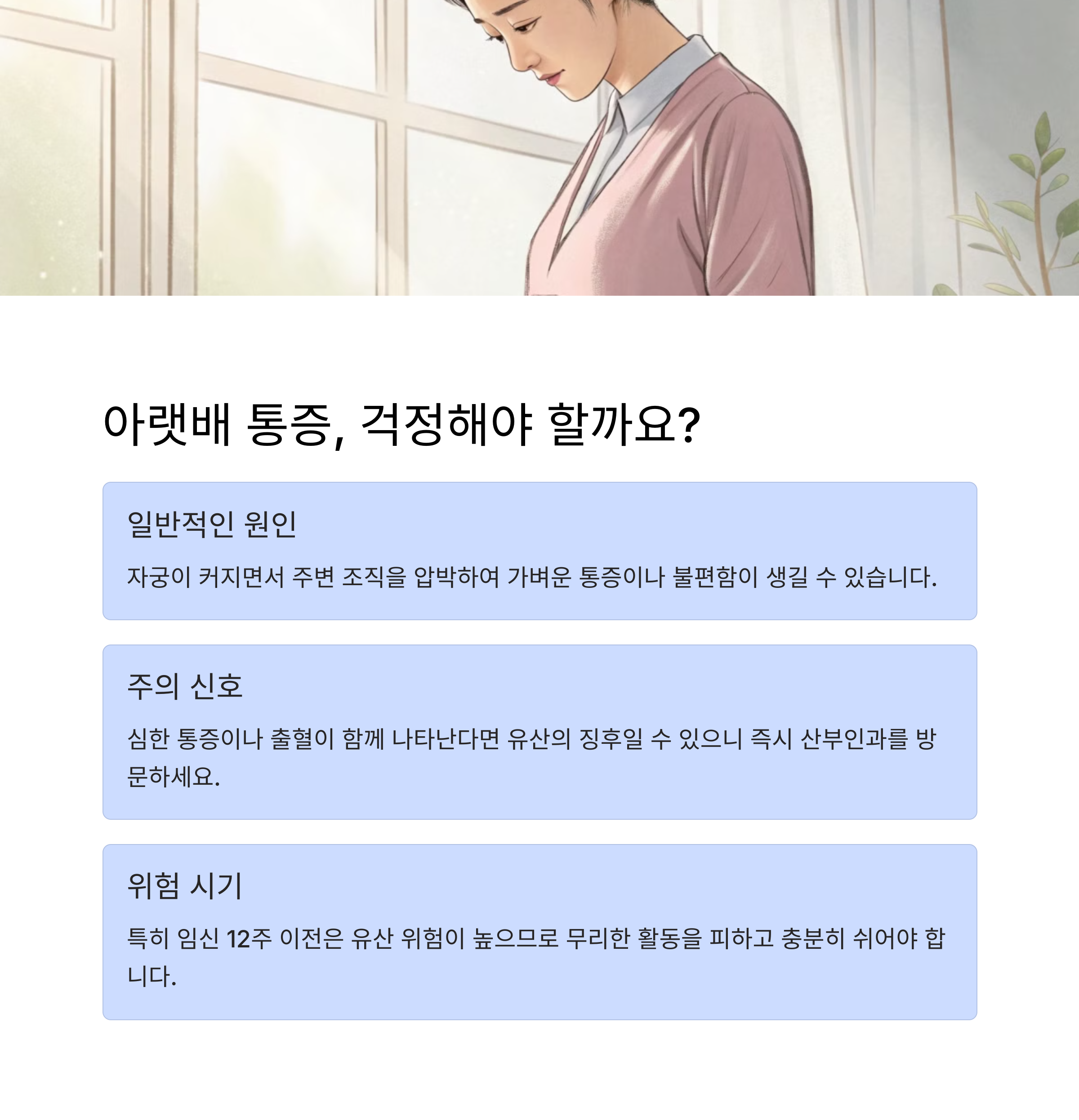 | 출혈 | 유산 징후일 가능성 있음 | 즉시 병원 방문 필수 |