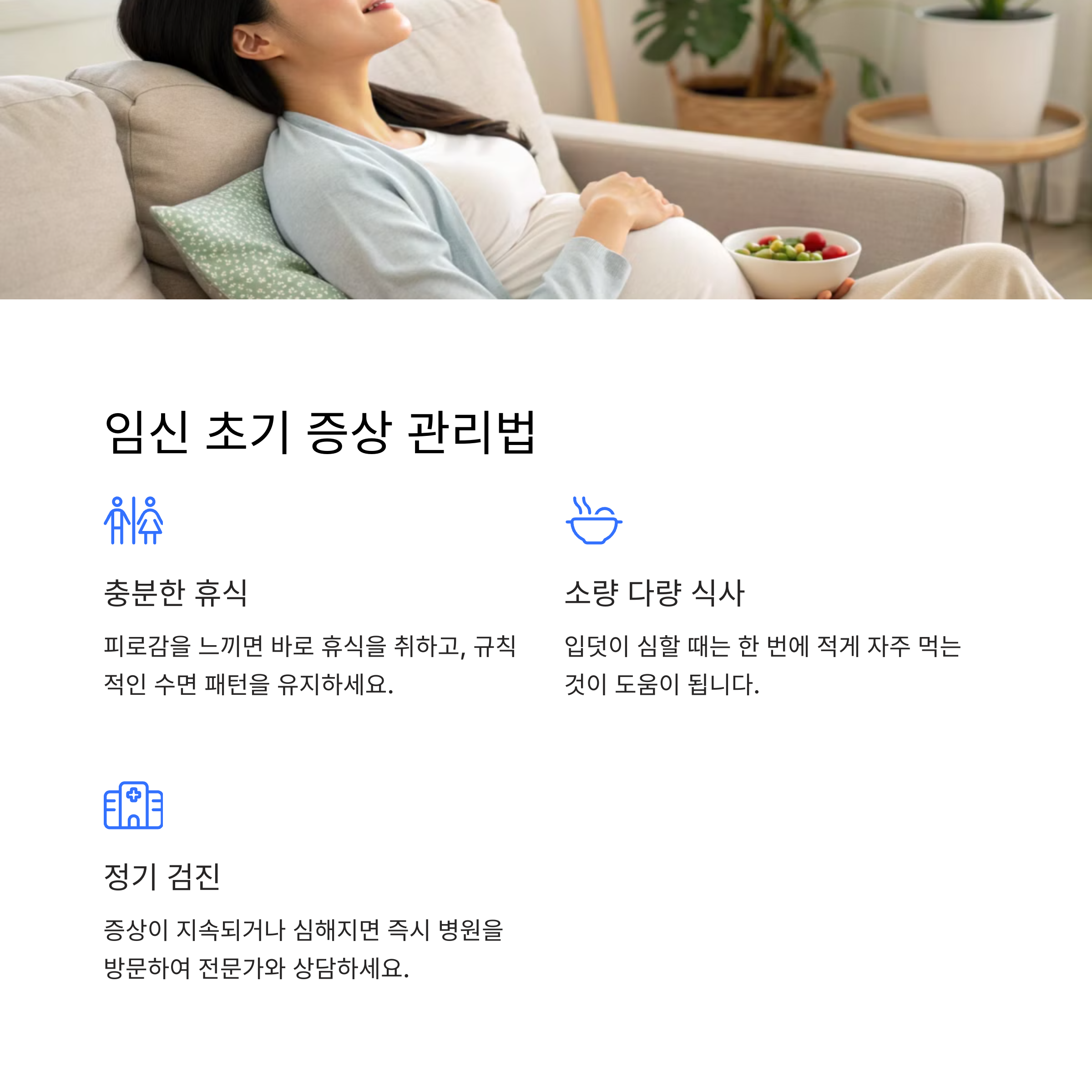 | 임신 초기 증상 | 생리 중단, 입덧, 유방 변화, 피로감, 빈뇨 |