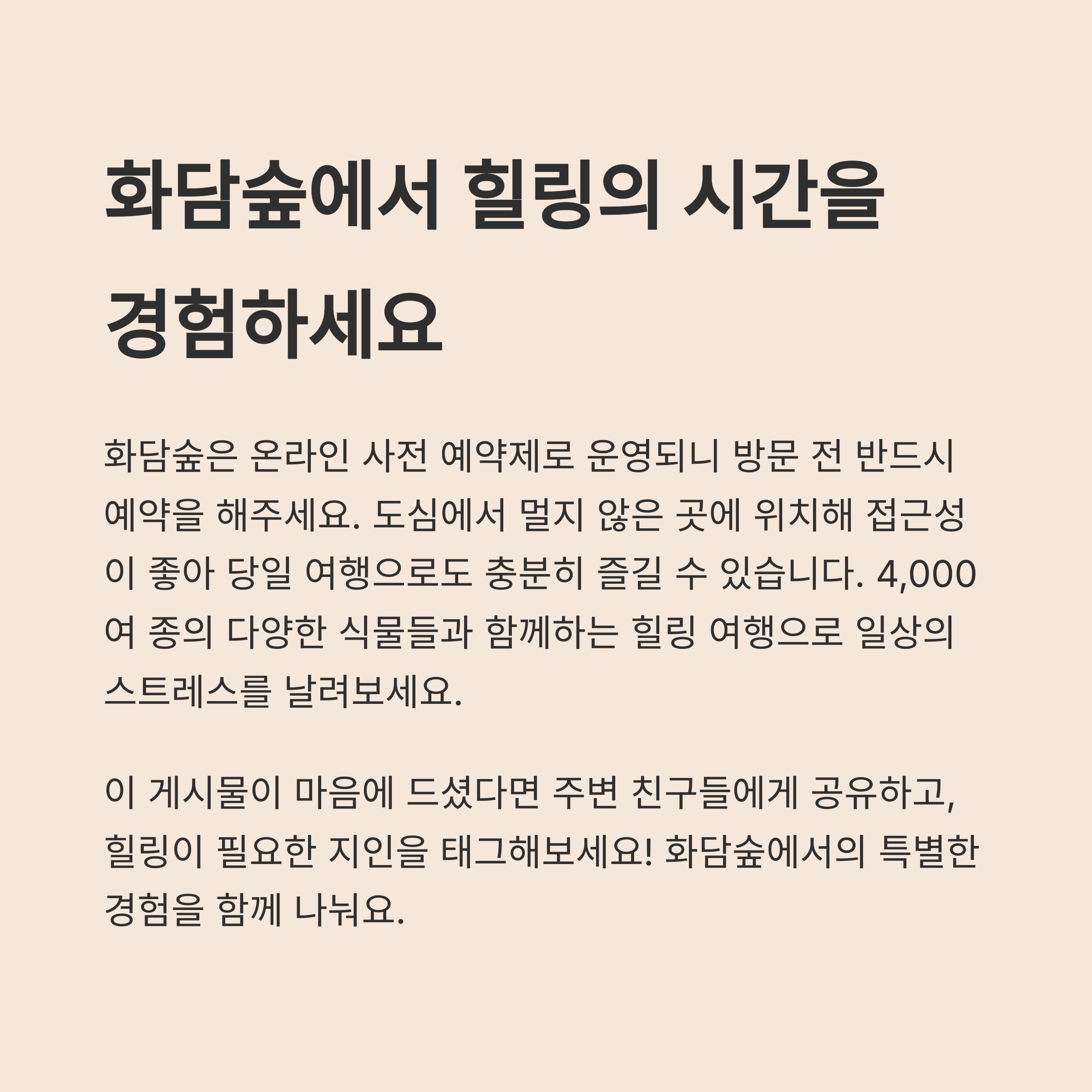 도심 속 힐링 여행을 원하신다면 화담숲이 최고의 선택입니다. 사계절 내내 아름다운 자연을 가까이에서 느끼고, 모노레일로 편안하게 숲을 둘러보며 여유를 만끽해보세요. 자연과 함께하는 웰빙 시간, 잠시 일상에서 벗어나 마음을 담아가는 여행이 되길 바랍니다. 이번 주말엔 화담숲으로 떠나보세요!