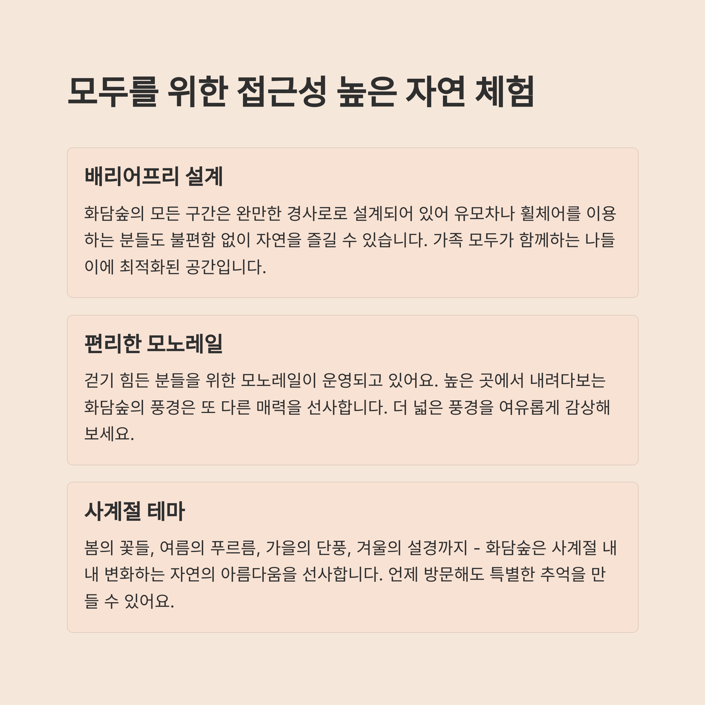 화담숲은 완만한 경사로 조성되어 있어 유모차와 휠체어도 이동이 용이하며, 모노레일이 있어 편안하게 숲 전경을 감상할 수 있습니다. 특히 모노레일을 타고 숲 위를 지나며 사계절 변화하는 풍경을 한눈에 담을 수 있어 인기가 많습니다.