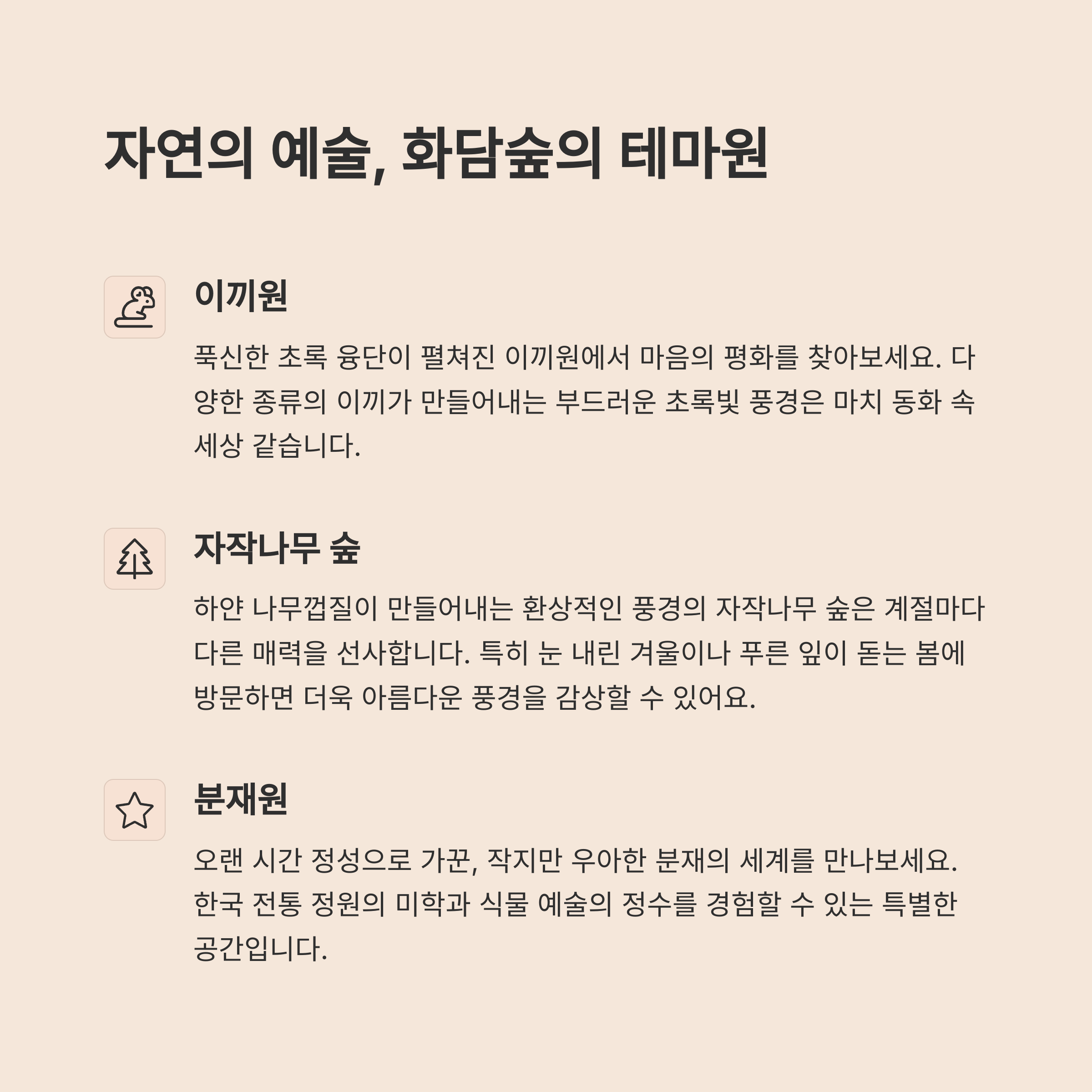 화담숲에는 각각의 매력을 지닌 테마원들이 조성되어 있어 다양한 식물과 자연을 만끽할 수 있습니다. 대표적으로 이끼원, 자작나무 숲, 분재원 등이 있으며, 각 테마원은 특색 있는 풍경을 자랑합니다. 특히 이끼원은 국내에서 보기 드문 다양한 이끼들이 자라 신비로운 분위기를 자아내고, 자작나무 숲은 하얀 줄기가 인상적이며, 분재원에서는 정교하게 가꾼 분재 작품들을 감상할 수 있습니다.