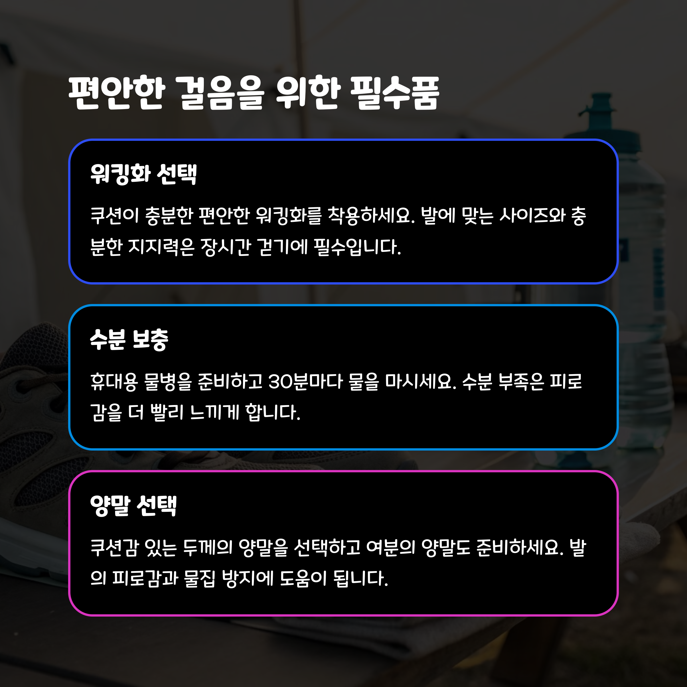 아래 팁을 실천하면 걷는 내내 훨씬 덜 피곤하고 다음 날도 덜 고생할 수 있답니다.