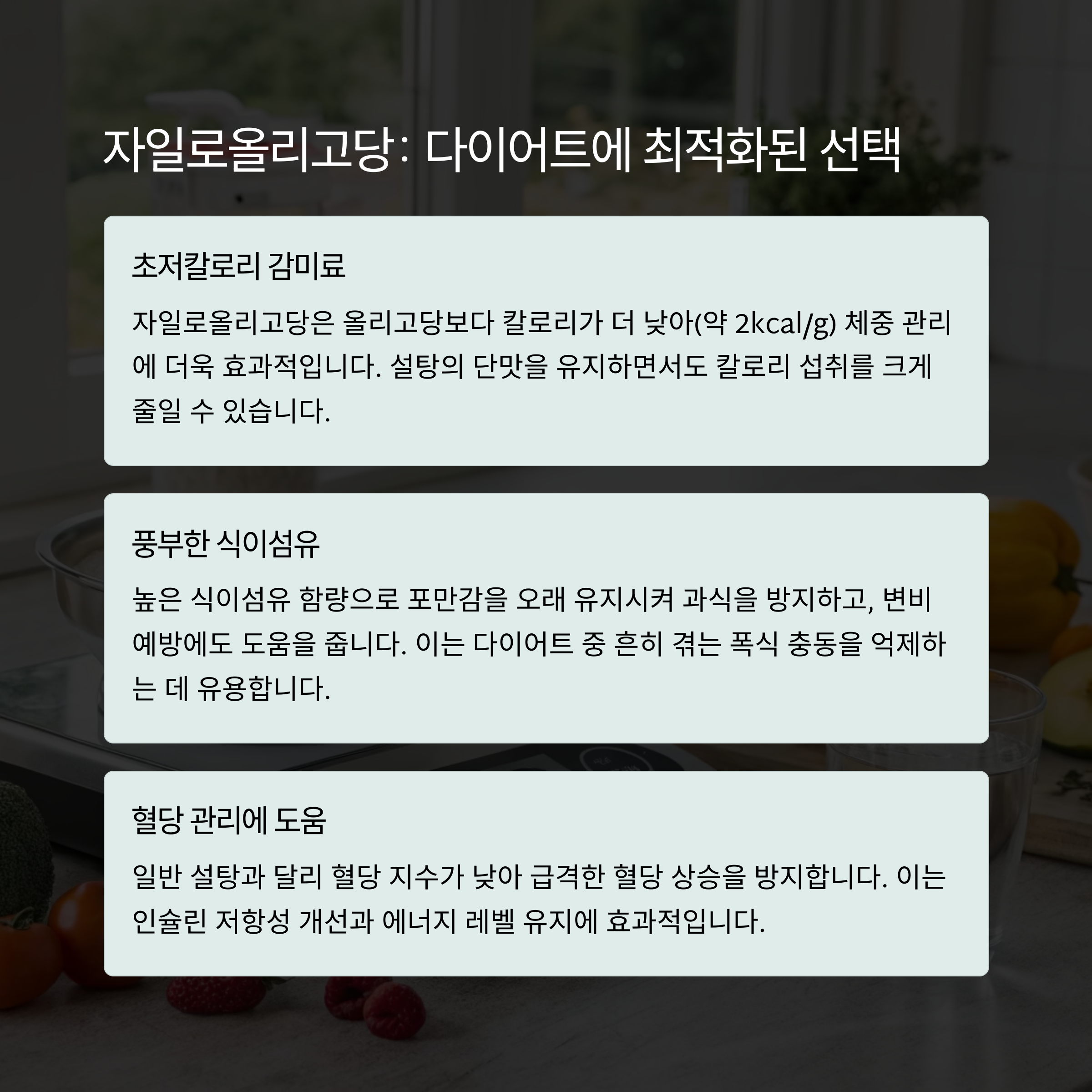 자일로올리고당이 더 저칼로리로 적합합니다. 식이섬유 함량도 높아 포만감 유도에도 도움이 됩니다.