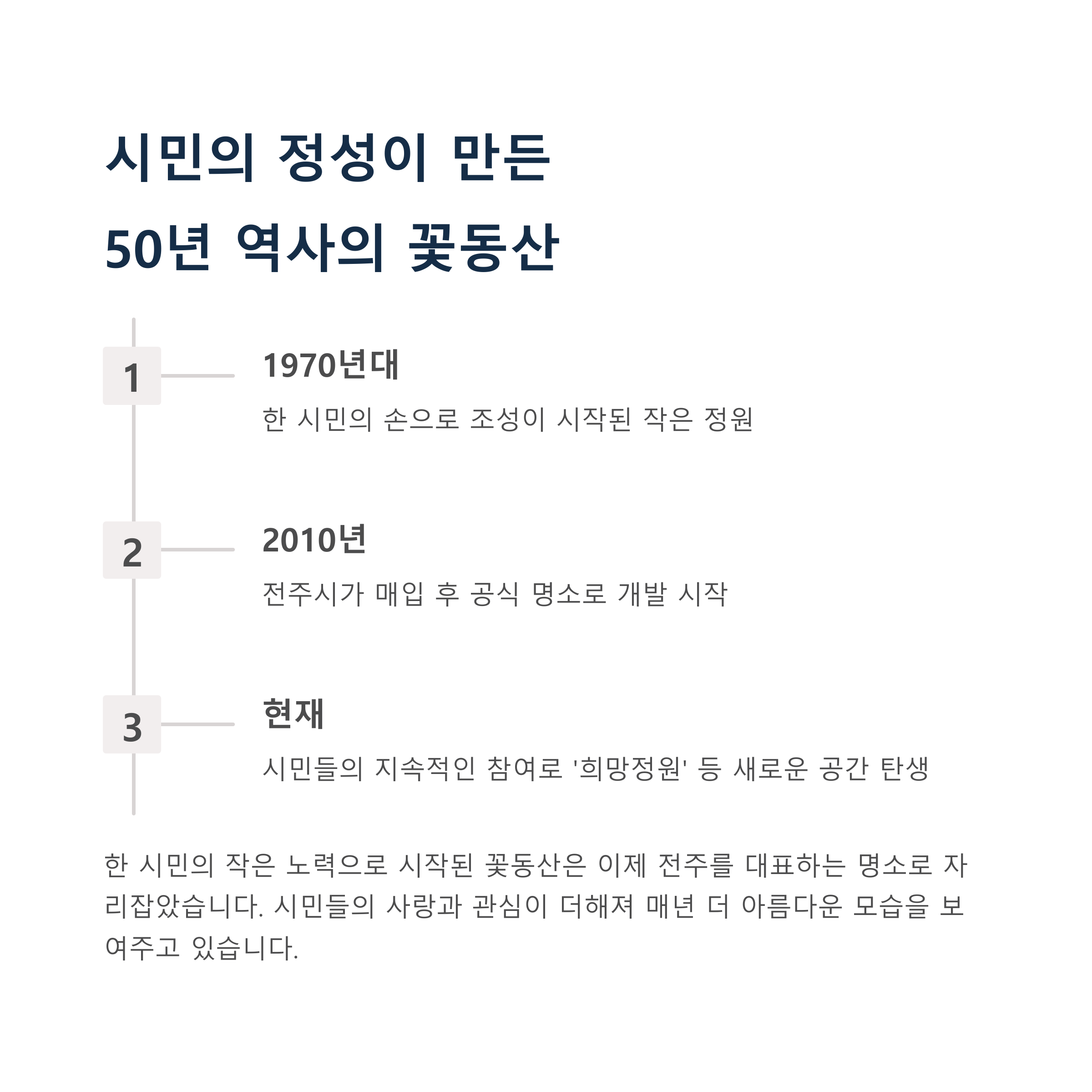 완산공원 꽃동산은 단순한 공원 조경이 아닌 한 시민의 정성과 세월이 깃든 공간입니다. 1970년대, 한 지역 주민이 직접 1,500여 그루의 꽃나무를 심고 40년 이상 가꿔온 개인 정원이 그 시작이었죠. 수십 년간 사람 손으로 일구어진 이 공간은 전주 시민들에게도 꾸준히 사랑받아왔고, 마침내 2009년 전주시가 해당 부지를 매입하여 정비 후 2010년부터 정식 개방되었습니다.