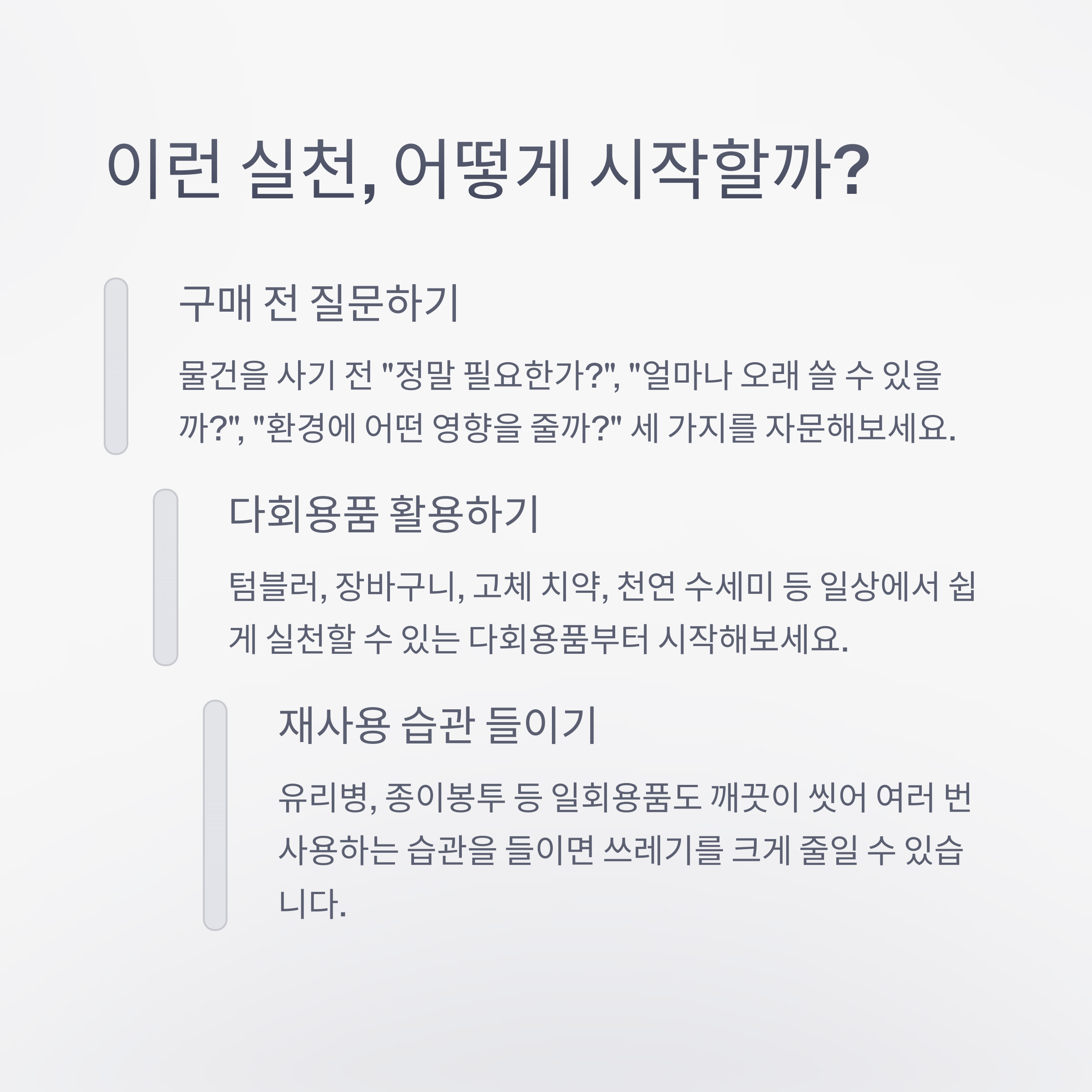 텀블러 들고 다니기, 장바구니 사용하기, 잔반 줄이기부터 시작해보세요.