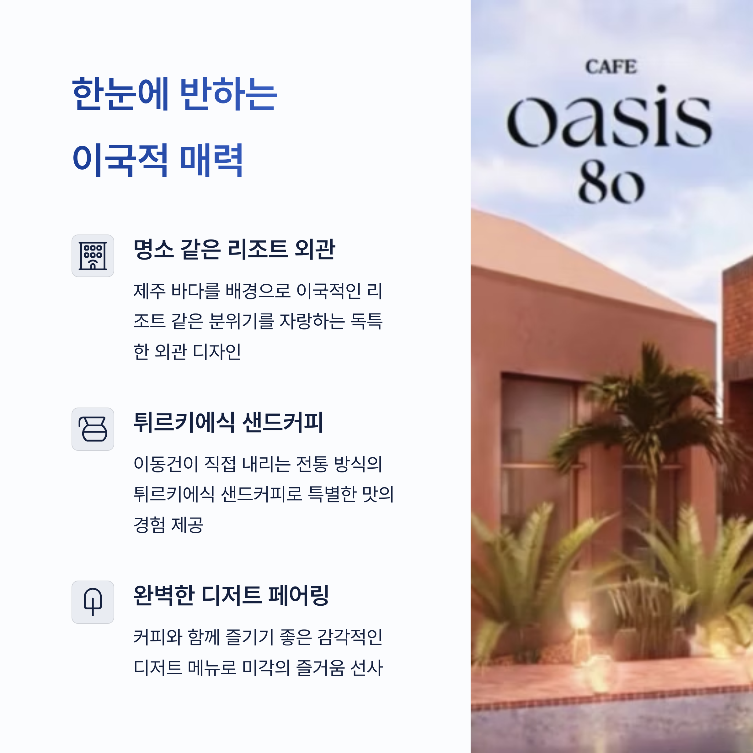 제주시 애월의 감성 한복판에 들어선 '오아시스 80'. 처음 보는 외관부터 눈길을 끕니다. 붉은 기와지붕과 브릭톤 벽면이 이국적인 분위기를 자아내고, 통창 너머로 보이는 야자수와 하늘빛이 마치 휴양지에 온 듯한 착각을 일으키죠. 그저 '커피를 마시는 공간'이 아닌, 잠시 머물며 쉬어가는 장소라는 게 첫 느낌에서부터 확실하게 전해져요.