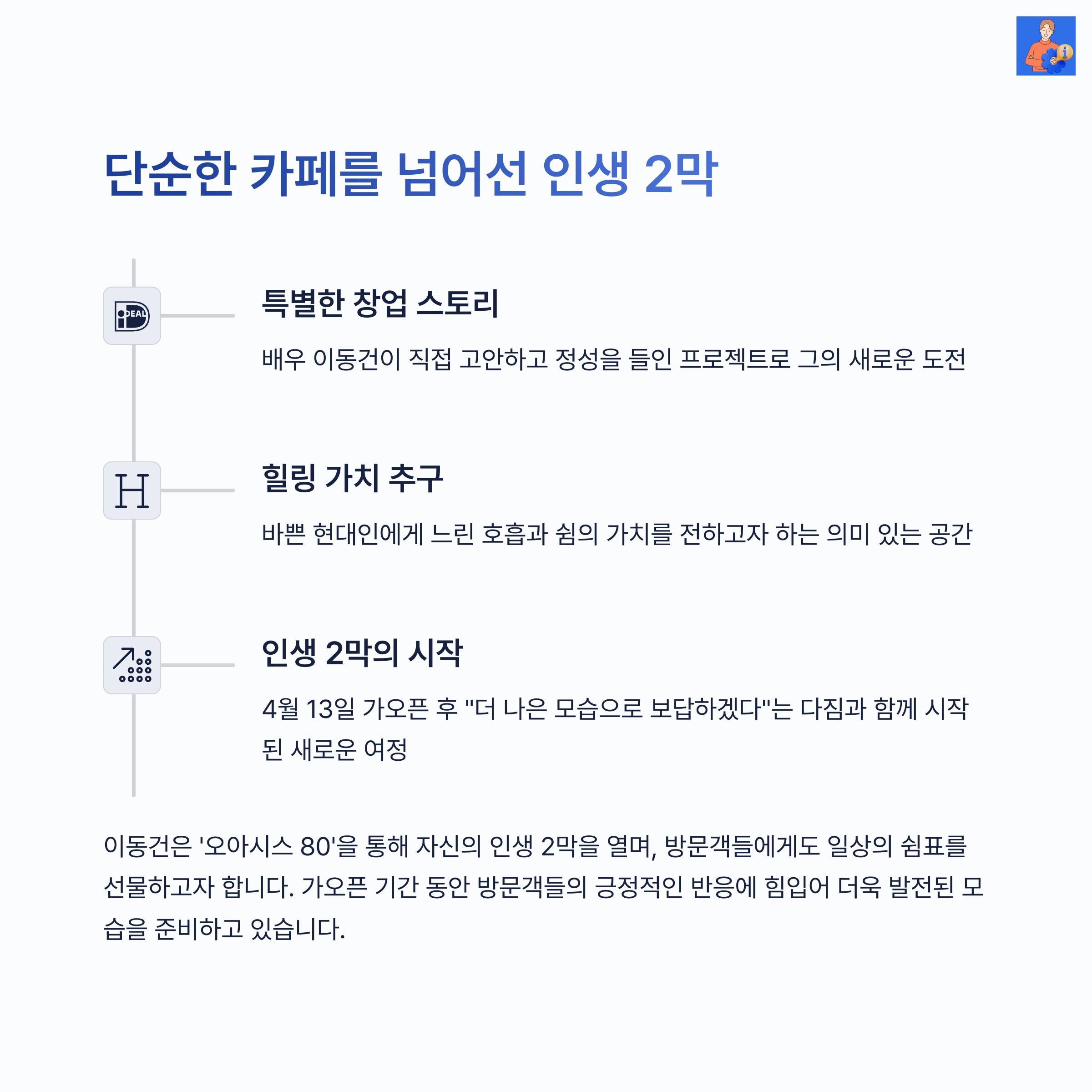 누구에게는 단순한 사업일 수 있지만, 이동건에게 오아시스 80은 단지 커피를 파는 공간이 아니에요. 그의 인생에서 두 번째 챕터를 여는 시작점이고, 사람들과 온기를 나누고 싶은 마음의 표현인 거죠. 그런 진심은 손님에게 자연스럽게 전달됩니다.