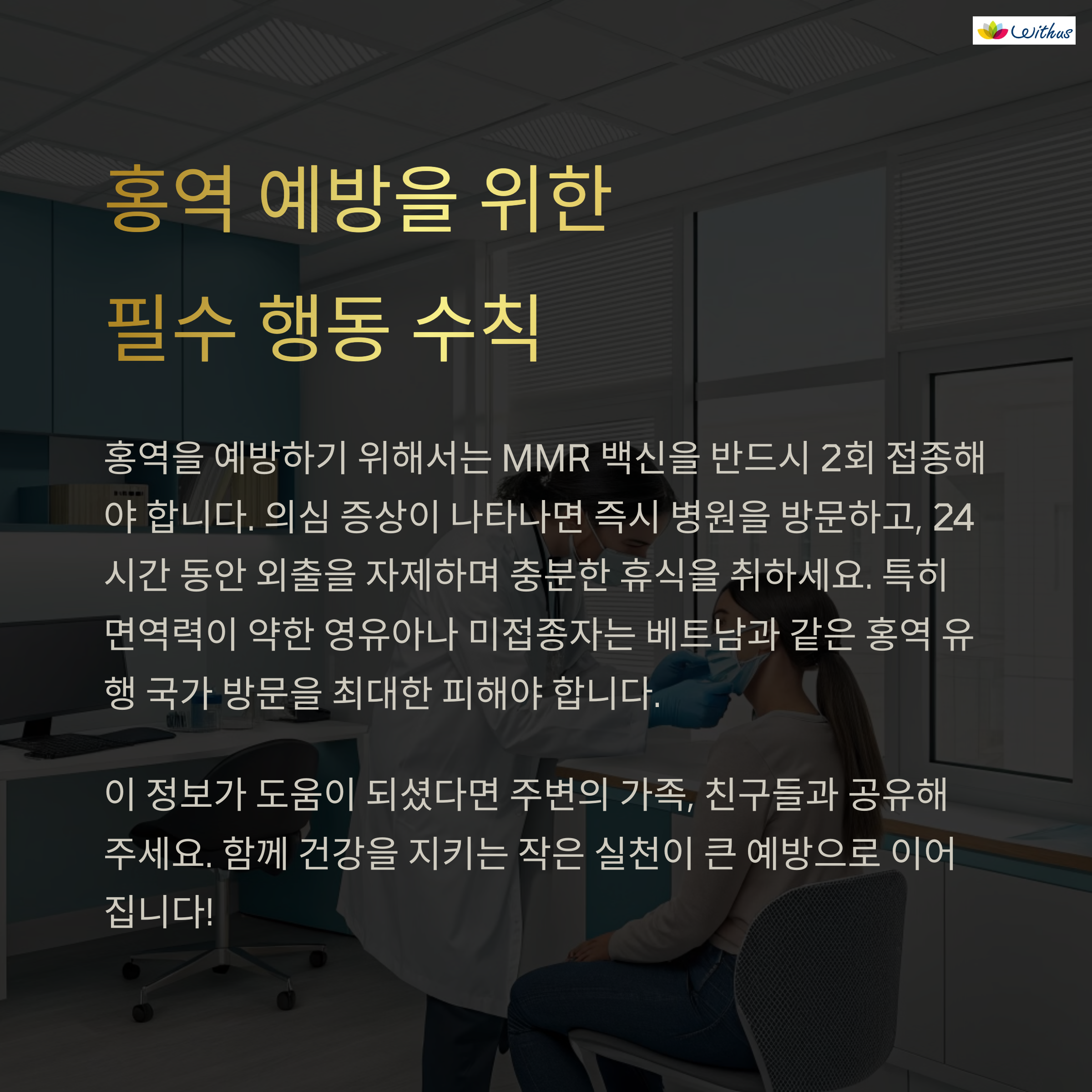 홍역 환자와의 접촉이 의심되거나 의심 증상이 발생할 경우, 즉시 병원을 방문하여 검사를 받고, 자가격리 등의 예방조치를 통해 가족과 주변 사람들의 건강을 지키는 것이 중요합니다. 정확한 정보와 예방 수칙을 숙지하여 홍역 확산을 막고, 건강하고 안전한 생활을 유지하길 바랍니다.