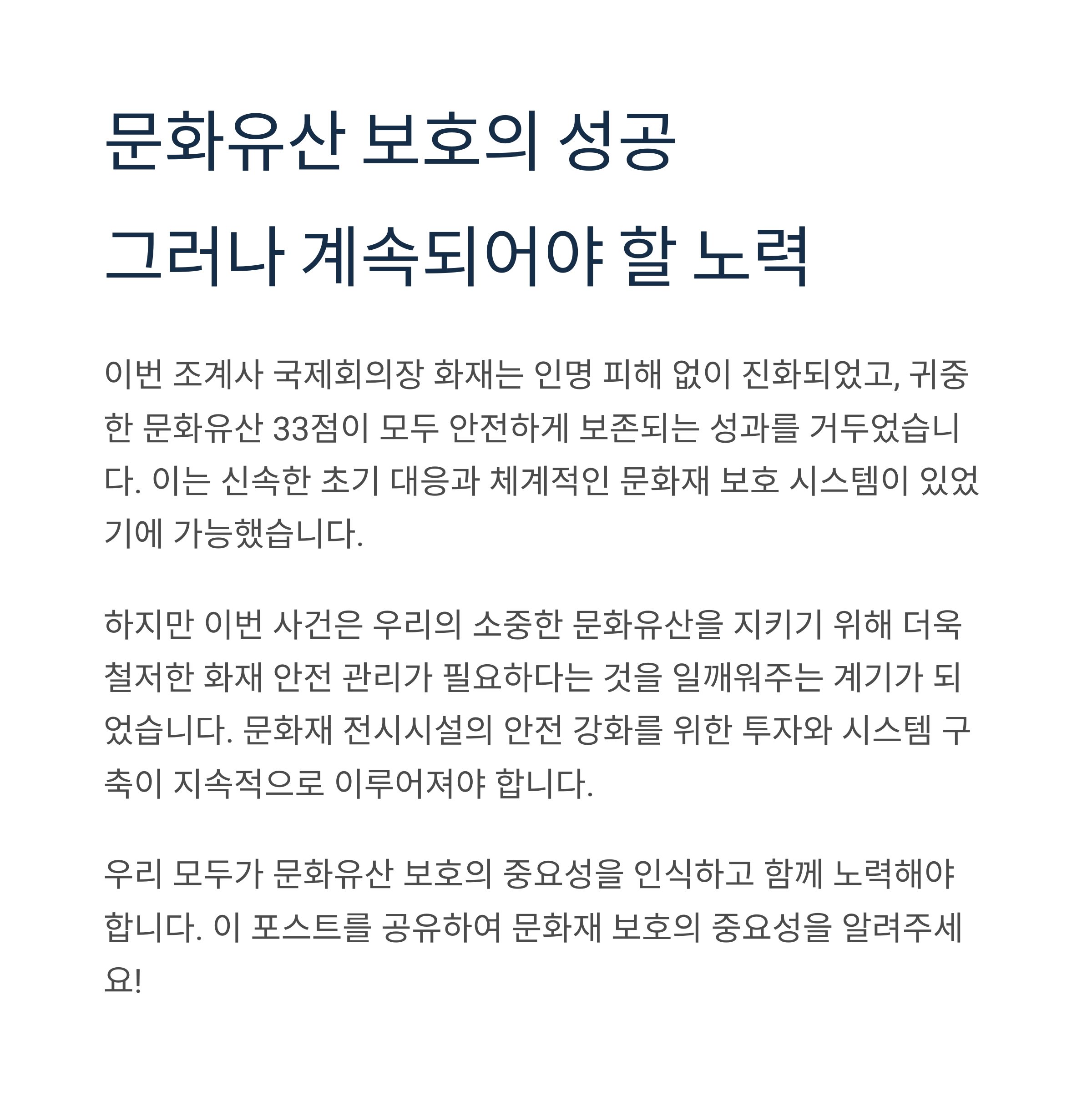 이번 조계사 화재는 무사히 마무리됐지만, 앞으로도 문화재 전시 시설의 안전 관리에 대한 지속적인 관심과 체계 정비가 필요하다는 점을 다시 한 번 일깨워줬습니다.