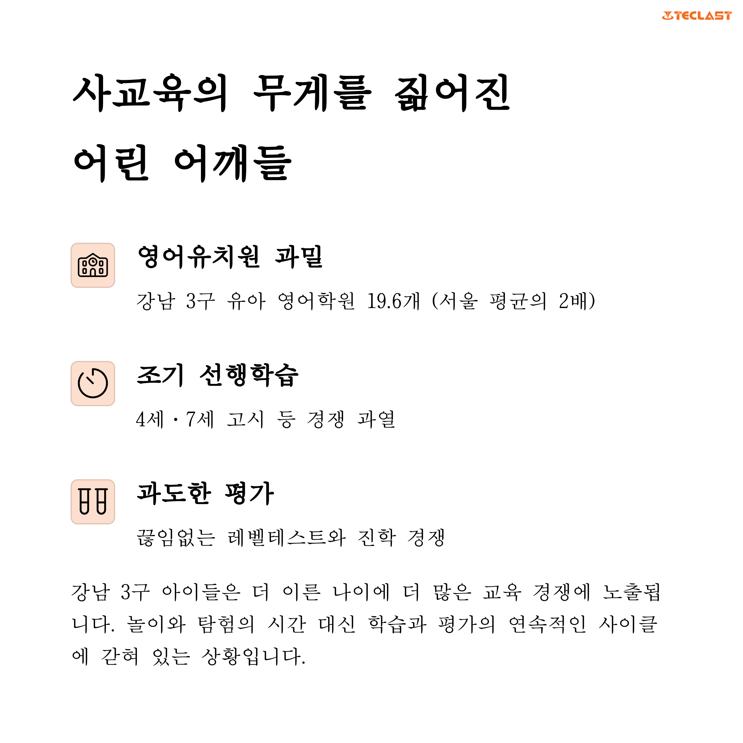 | 조기 사교육 과열 | 영유아기부터 영어·수학 선행, 성적 경쟁 압박 |