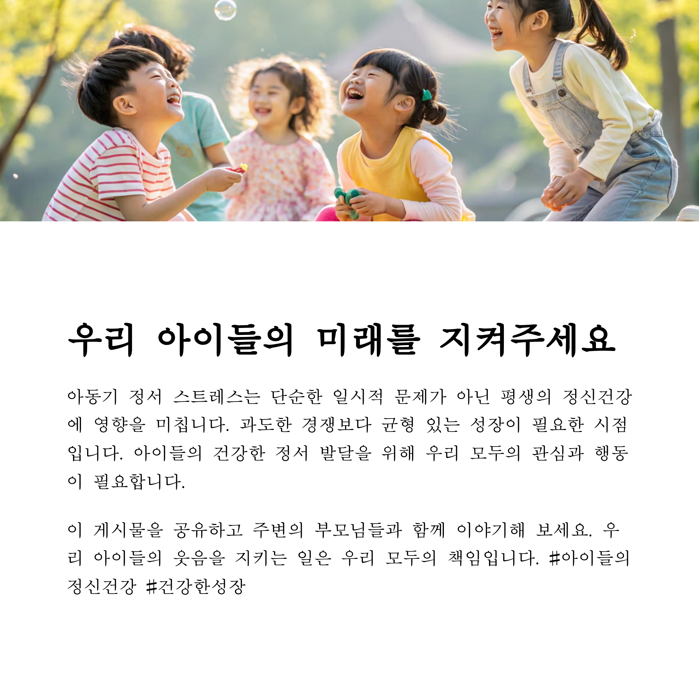 이번 강남 3구 아동 정신건강 통계는 단순한 숫자가 아니라 우리 사회가 무엇을 놓치고 있는지 보여주는 경고였습니다. 아이들에게 필요한 것은 더 빠른 학습이 아니라, 자유롭게 뛰놀고 마음껏 감정을 표현할 수 있는 환경입니다. 부모와 사회 모두가 '성적'보다 '건강한 마음'을 먼저 생각하는 문화를 만들어야 합니다. 우리 아이들의 행복한 미래는 그 마음에서 시작되니까요.