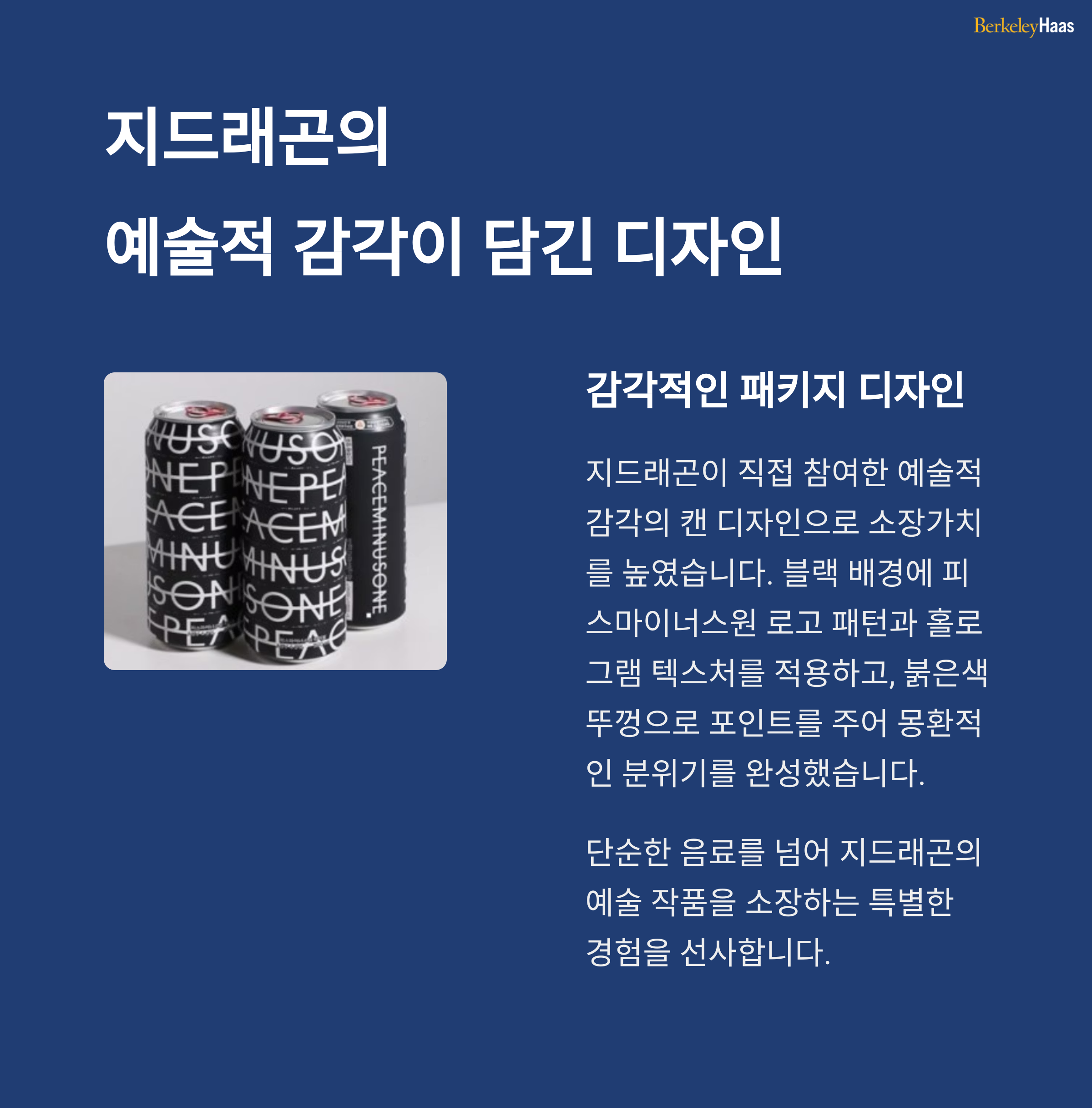 단순한 시음 행사를 넘어, 브랜드 세계관을 시각적으로 표현한 이 오프라인 이벤트는 지드래곤의 감각적인 기획력을 다시 한 번 보여준 사례로 평가받고 있습니다.
