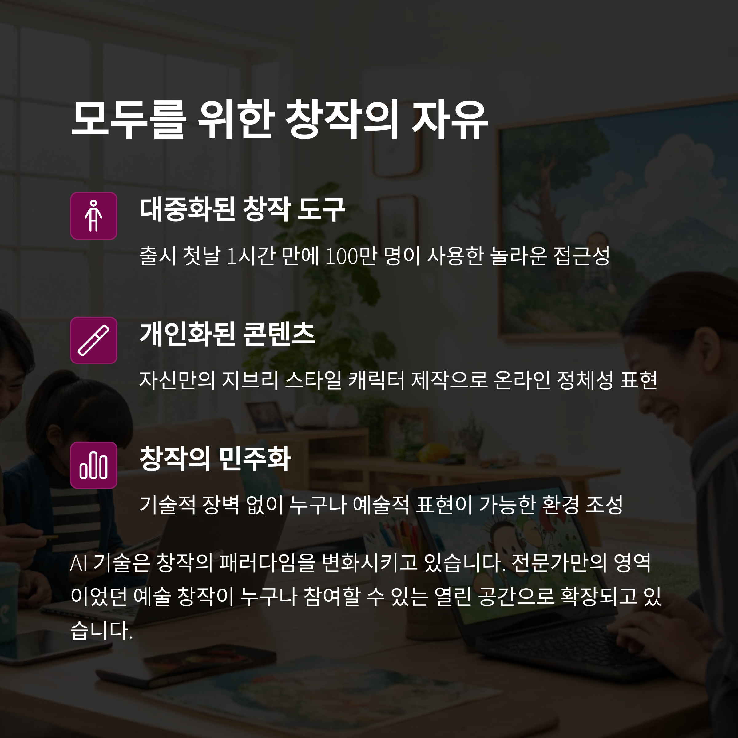지브리 프사를 통해 AI와 콘텐츠 산업이 어떻게 융합되고 있는지 함께 살펴보았습니다. AI 기술은 창작의 영역을 확장하며 개인화된 콘텐츠 제작을 가능하게 합니다. 그러나 동시에 저작권 문제와 개인정보 보호 이슈를 함께 고민해야 하는 과제를 던져주죠. 여러분은 AI와 인간의 협업이 콘텐츠 혁명을 어떻게 이끌어갈 것이라고 생각하시나요? 댓글로 의견을 나눠주세요! 앞으로도 AI와 창작의 새로운 가능성을 함께 탐구해 보아요.