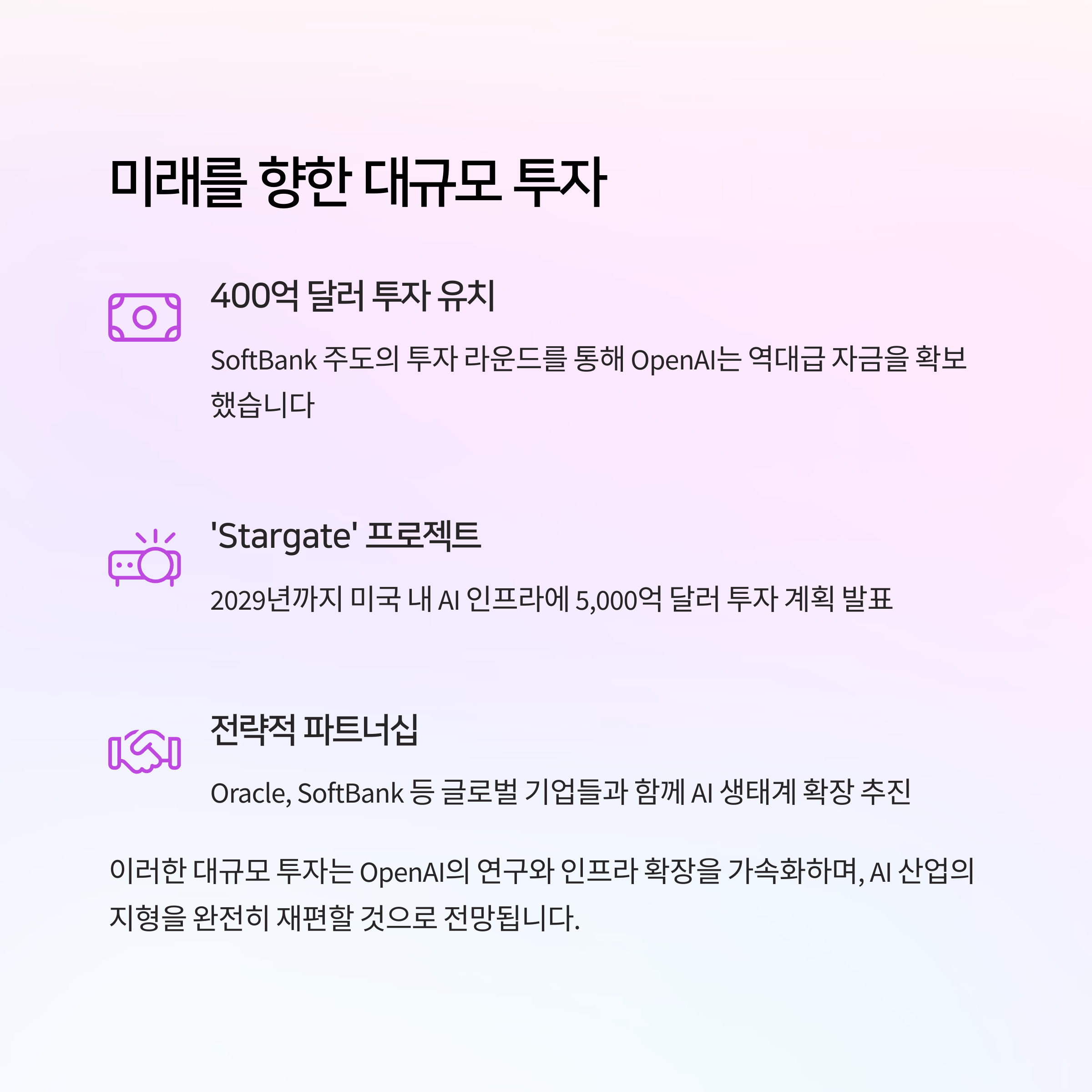 | Stargate 프로젝트 | AI 인프라 구축 | 5,000억 달러 | 2029년 |