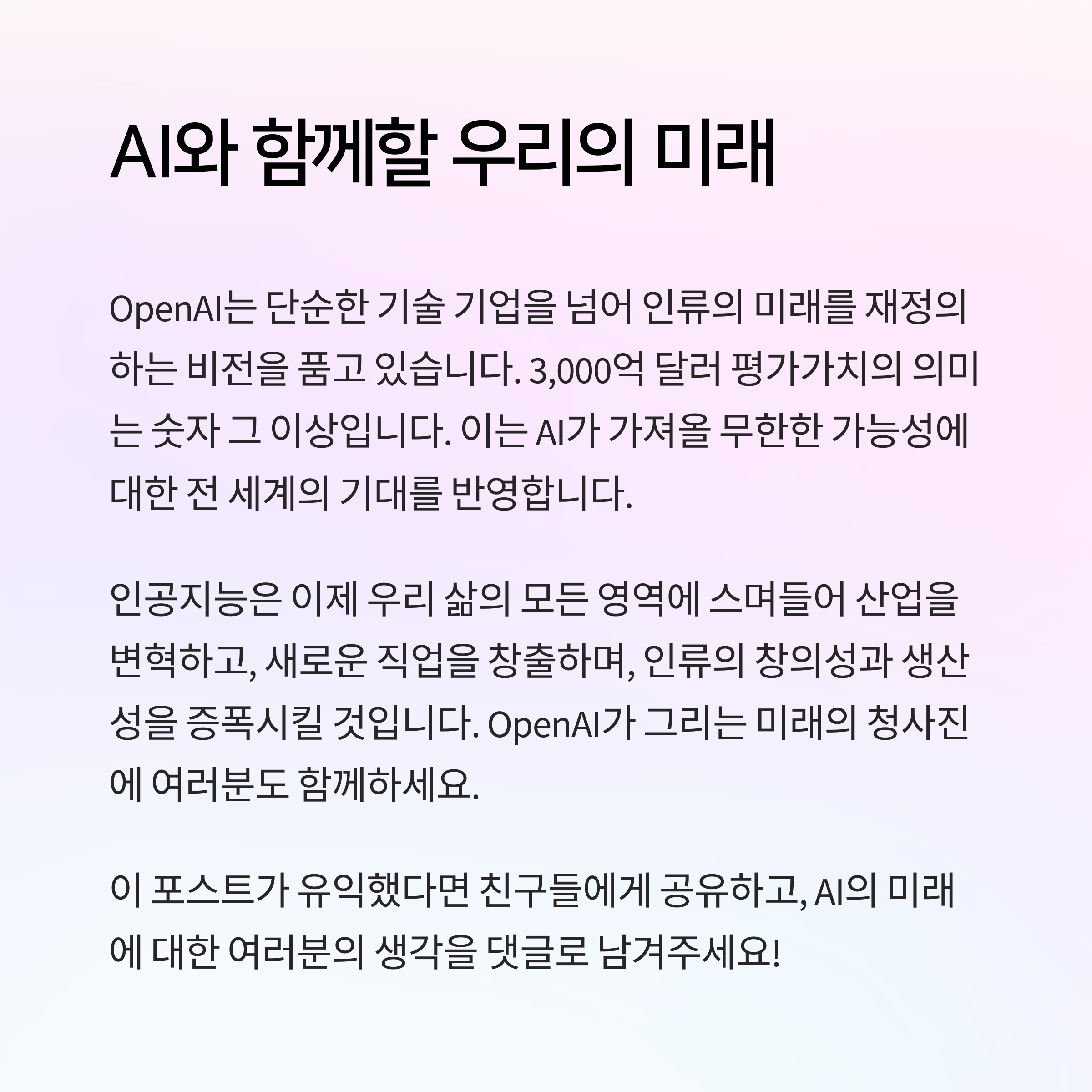 AI 기술은 빠르게 발전하며 우리의 일상과 산업 전반에 깊은 영향을 미치고 있습니다. OpenAI의 혁신적인 연구와 기술 발전은 앞으로도 AI 산업의 판도를 크게 바꿀 것입니다. 앞으로도 지속 가능한 AI 발전을 위해 우리는 윤리적 측면과 기술 활용 방안을 함께 고민해야 합니다.
