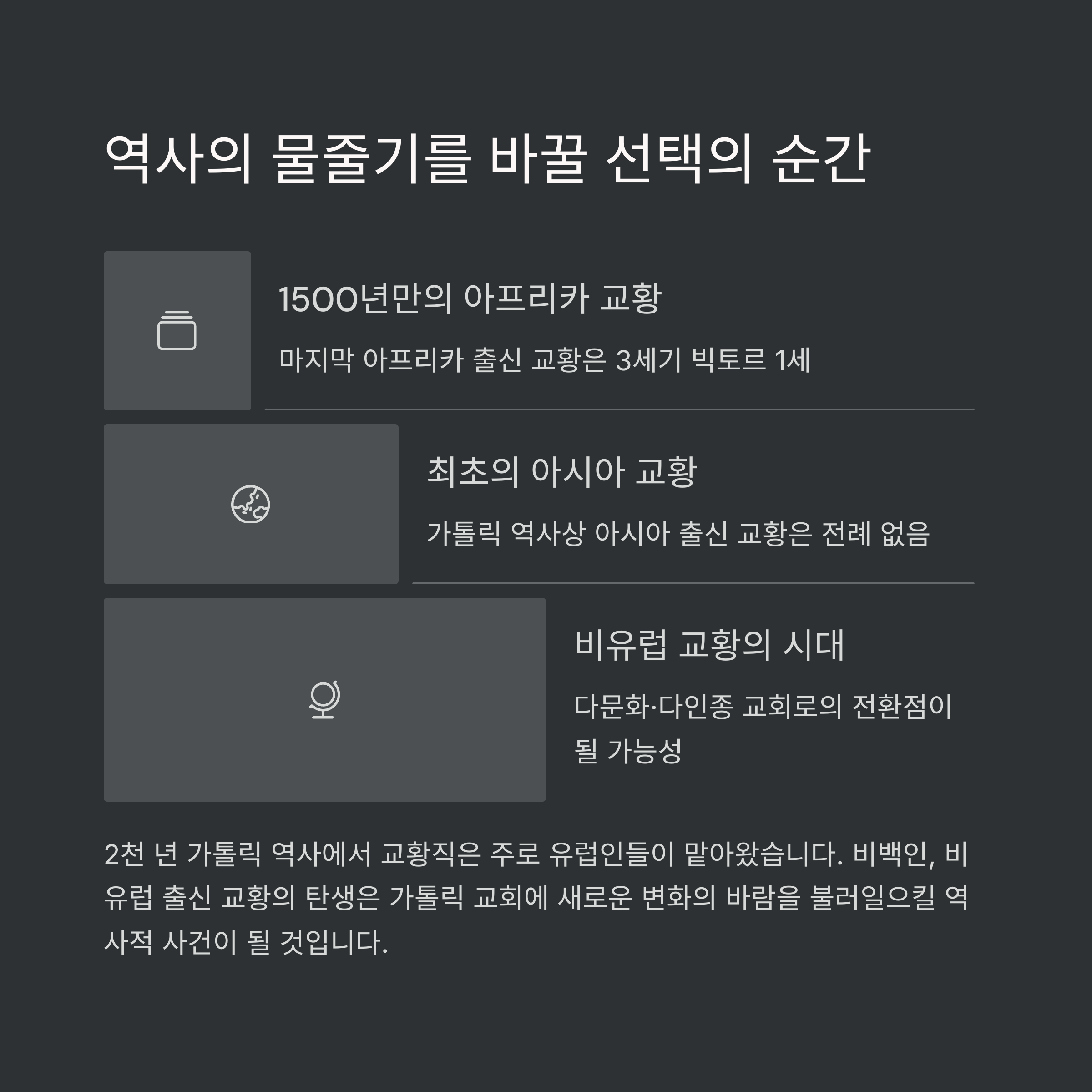 역사적으로 교황청의 중심은 유럽이었고, 지금까지 선출된 266명의 교황 중 263명이 유럽 출신입니다.