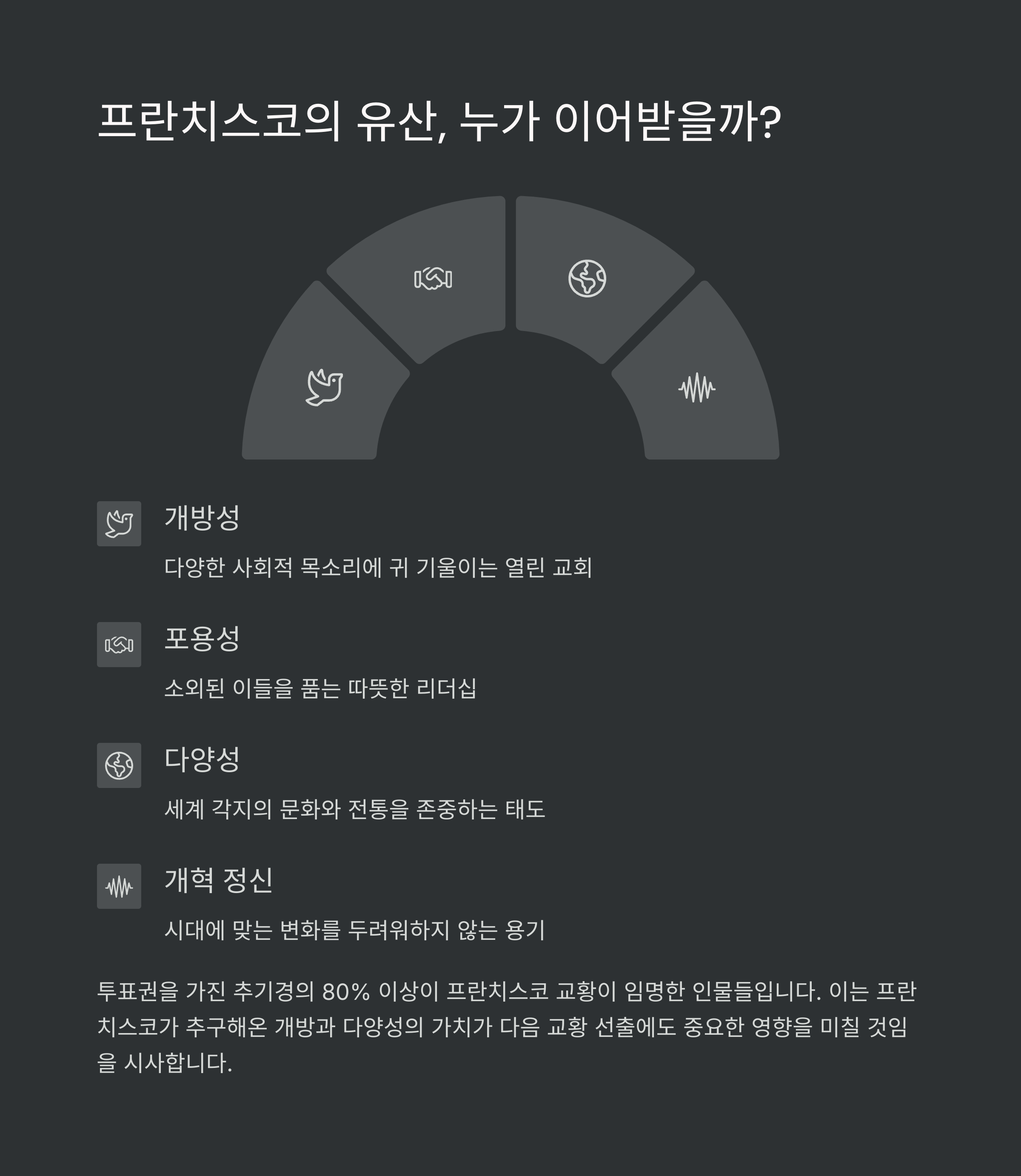 교황 선종이라는 역사적 전환점 앞에서, 우리는 단지 종교 지도자만을 기다리는 것이 아닙니다. 차기 교황은 인류와 지구, 평화와 다양성의 시대를 이끌 정치적·정신적 리더가 될 수 있기에 그의 국적, 성향, 목소리에 전 세계가 주목하고 있습니다. 프란치스코 교황의 유산을 이어갈지, 아니면 전환의 시대를 맞을지는 곧 있을 콘클라베에서 명확히 드러나겠죠. 당신은 어떤 교황을 원하시나요?