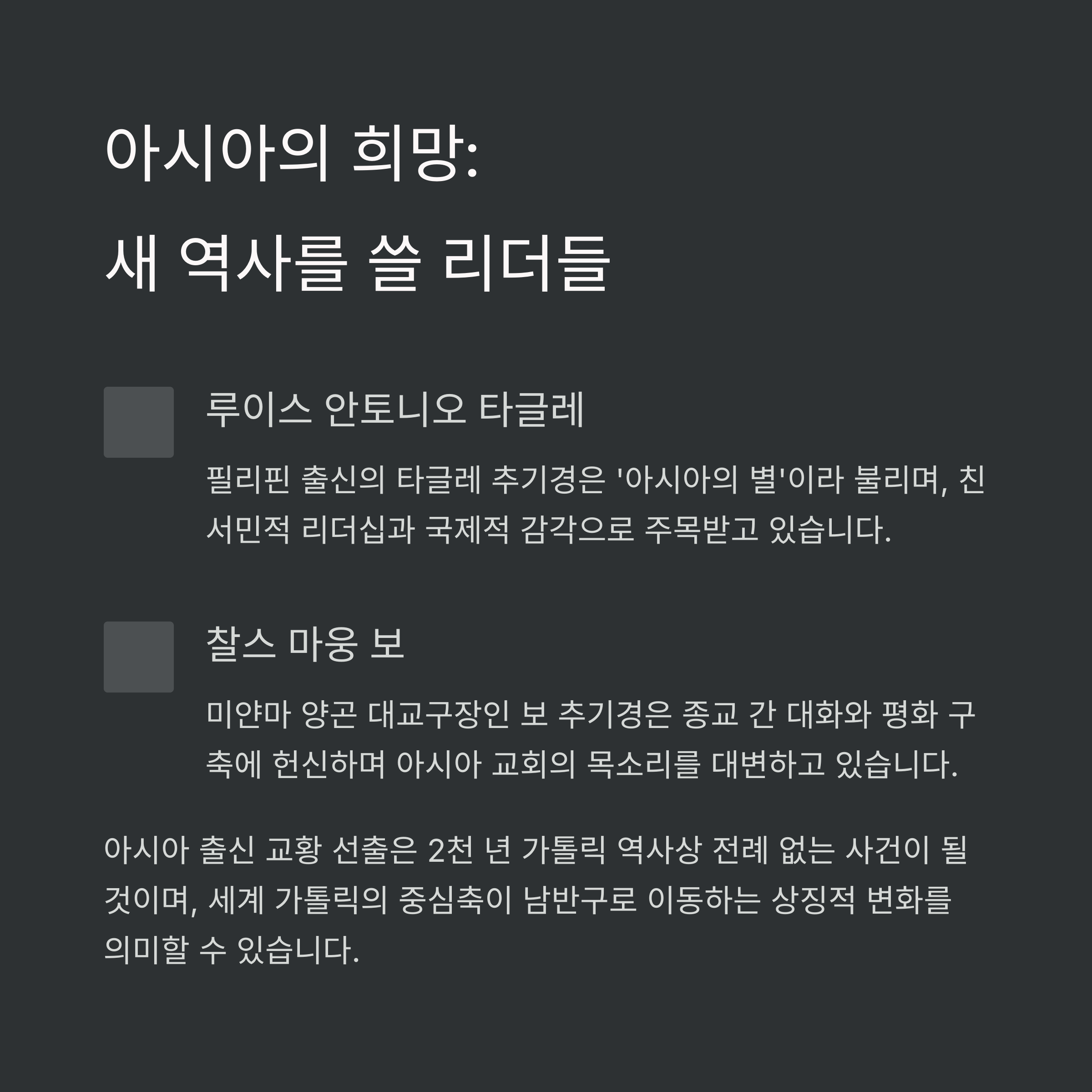 이들은 교회 내 개혁과 포용을 지지하는 인물들로, 전통과 권위의 중심인 유럽과는 다른 관점을 제시합니다. 다만 교황청 내 행정 경험과 정치적 영향력은 유럽권 인사에 비해 약하다는 평가도 상존합니다.