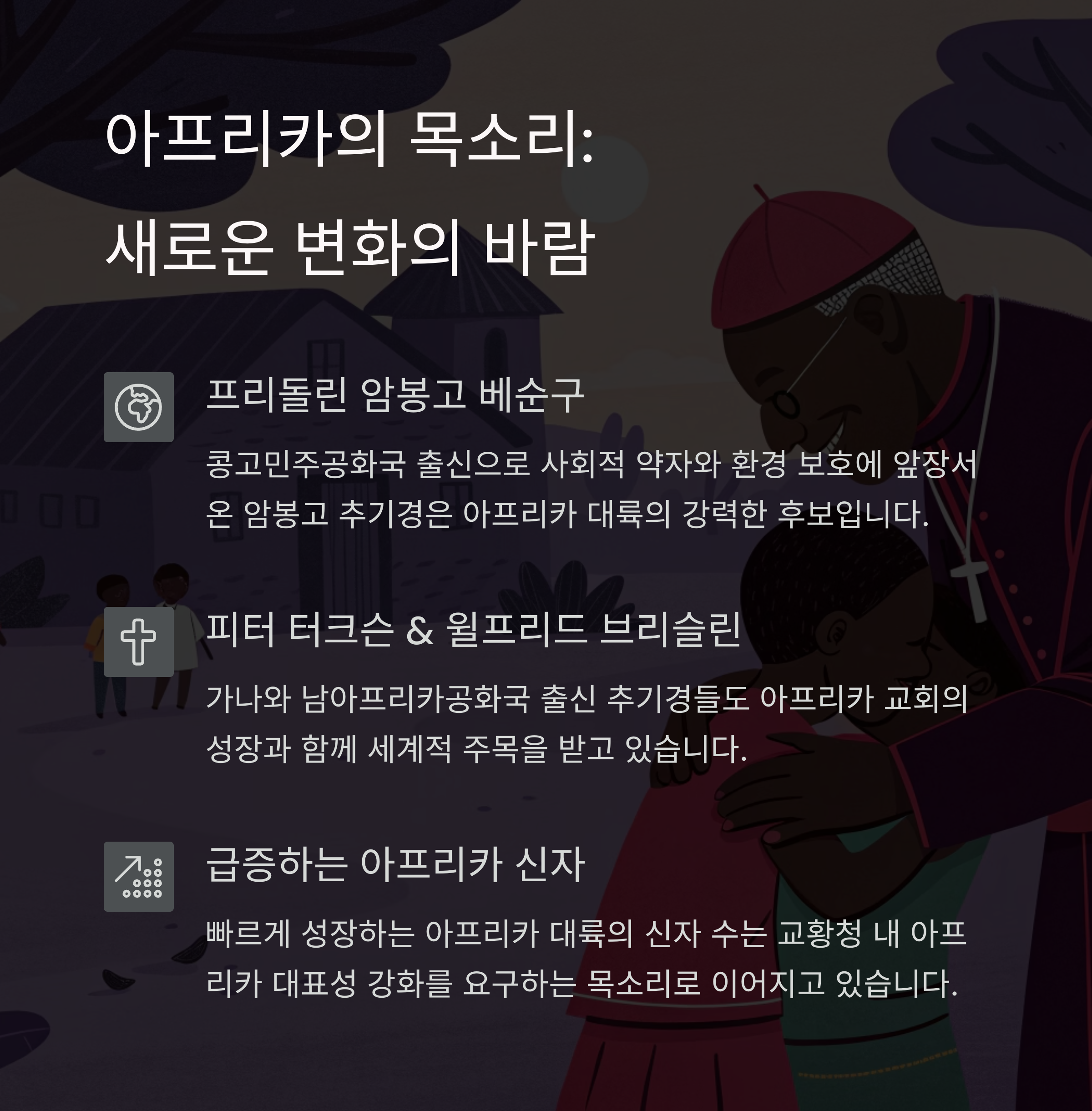 이들은 교회 내 개혁과 포용을 지지하는 인물들로, 전통과 권위의 중심인 유럽과는 다른 관점을 제시합니다. 다만 교황청 내 행정 경험과 정치적 영향력은 유럽권 인사에 비해 약하다는 평가도 상존합니다.