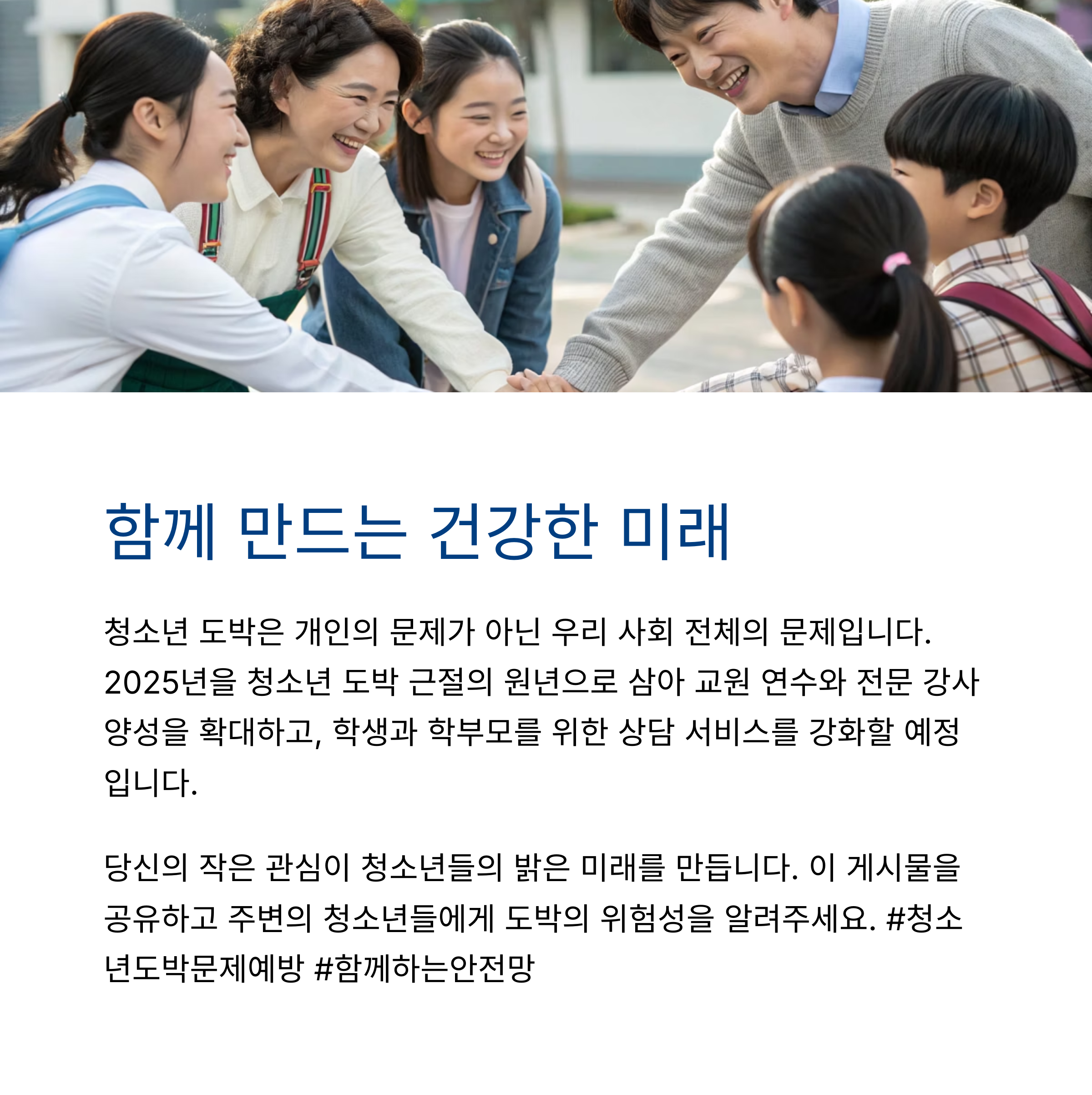 청소년 도박은 먼 이야기가 아닙니다. 스마트폰과 인터넷을 자유롭게 이용하는 이 시대의 청소년들에게 도박은 점점 더 가까이 다가오고 있죠. 그래서 이번 예방주간은 단순한 행사를 넘어, 우리 모두가 함께 고민하고 대응해야 할 사회적 메시지를 담고 있습니다. 나와 내 아이, 그리고 우리 사회 전체가 더 안전하고 건강해지기 위해 지금부터라도 작은 관심과 실천이 필요합니다. 이 글을 읽고 계신 여러분이 바로 그 첫걸음을 내딛는 분들이시길 바랍니다.