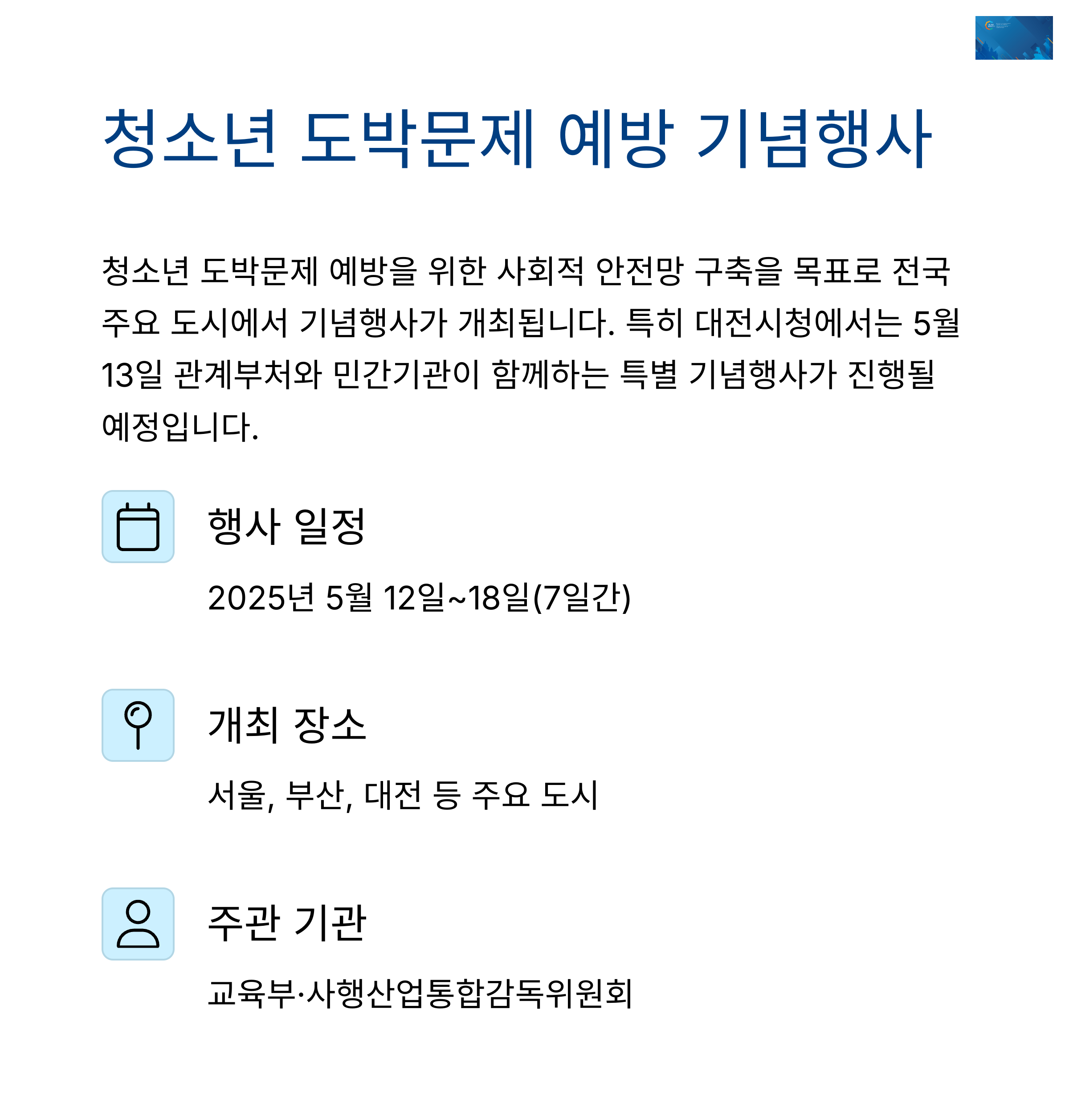 가장 주목할 만한 행사는 대전에서 열리는 본행사입니다. 5월 13일(월) 오후 1시부터 4시까지 대전시청 대강당에서 개최되는 이번 행사는 기념식, 예방특강, 유관기관 부스 운영으로 구성돼 있어요. 서울과 부산에서도 지역별 기념행사가 준비되어 있으며, 학생들과 학부모가 함께 참여해 실질적인 정보를 얻을 수 있는 장으로 꾸며질 예정입니다. 현장에서 진행되는 체험 프로그램도 알차게 구성되어 있으니 관심 있는 분들은 일정을 꼭 체크해보세요.