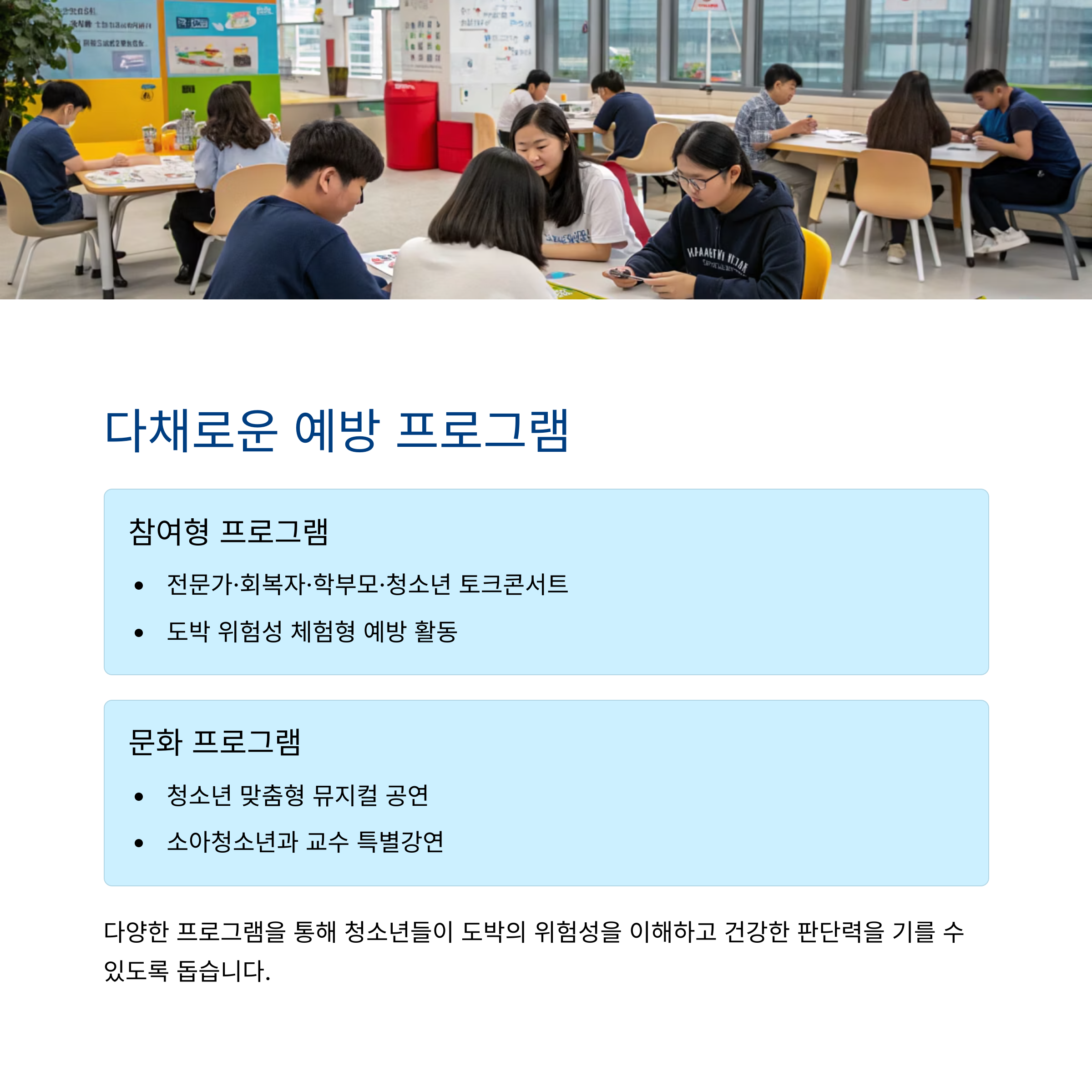 청소년 시기의 도박은 단순한 호기심이나 재미에서 시작되지만, 중독성이 높고 자아 형성에 치명적 영향을 미칩니다. 더욱이 최근에는 SNS, 유튜브, 모바일 게임 등을 통해 도박과 유사한 구조의 콘텐츠가 무분별하게 노출되고 있어, 어린 학생들이도박이라는 사실조차 인지하지 못한 채 위험에 노출되곤 하죠. 도박 경험이 있는 청소년은 학교 부적응, 자해·자살 시도, 범죄 연루 등 심각한 사회 문제로 이어질 가능성이 높다는 연구 결과도 있습니다.