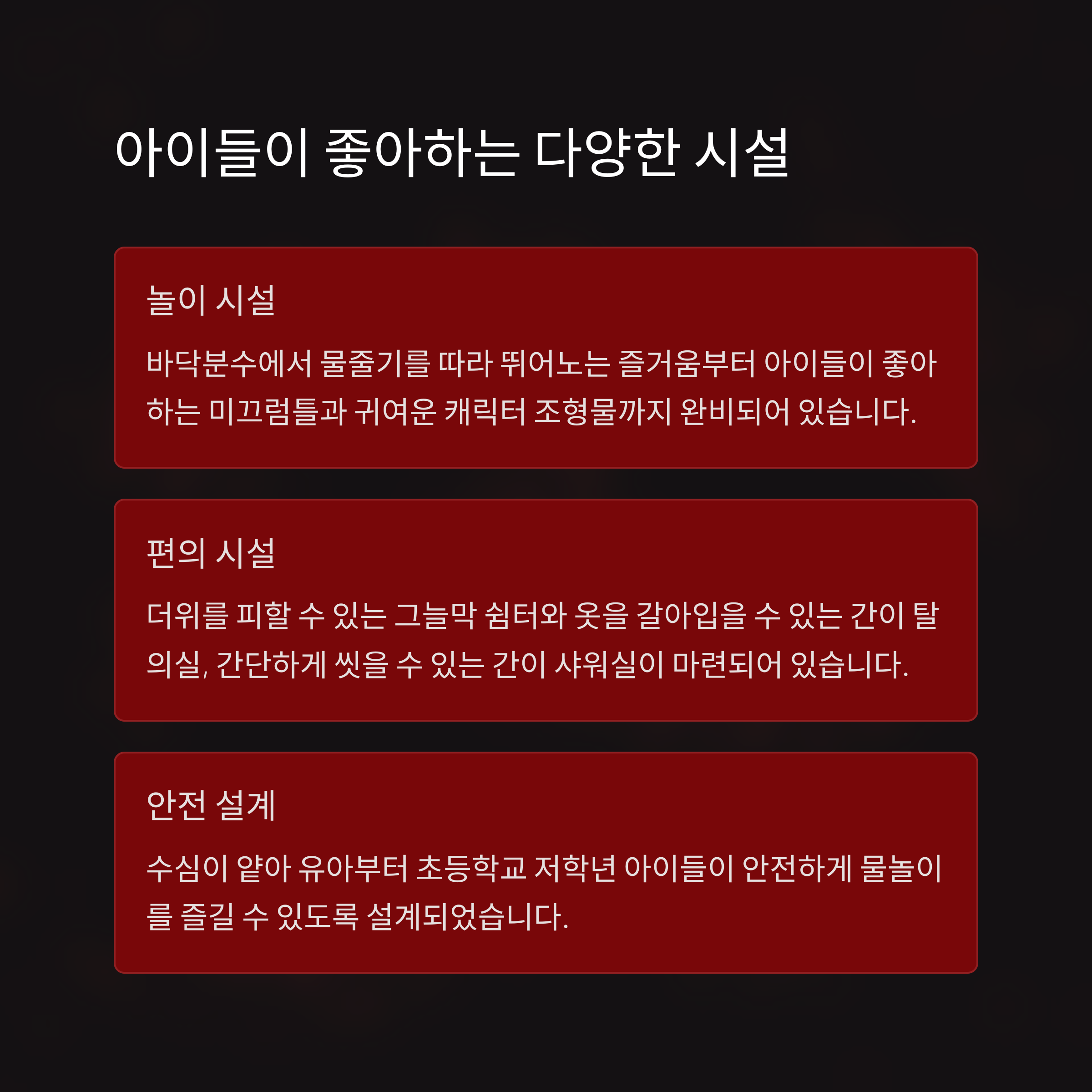 아이들이 안전하고 즐겁게 놀 수 있는 다양한 물놀이 시설이 마련돼 있어요.