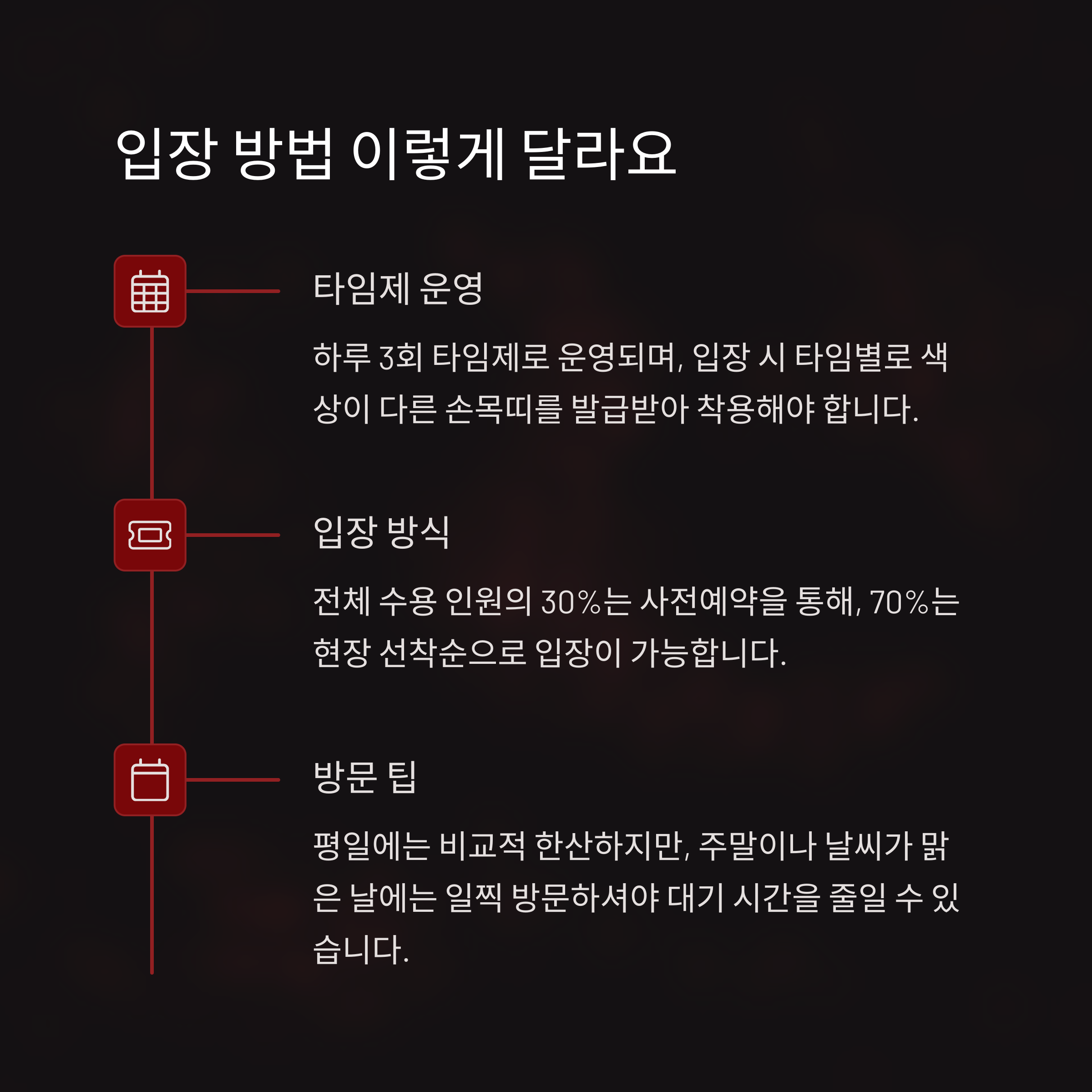 입장 방식은 무료이지만 선착순이며, 사전 예약이 30%, 현장 선착순 70%를 차지합니다.