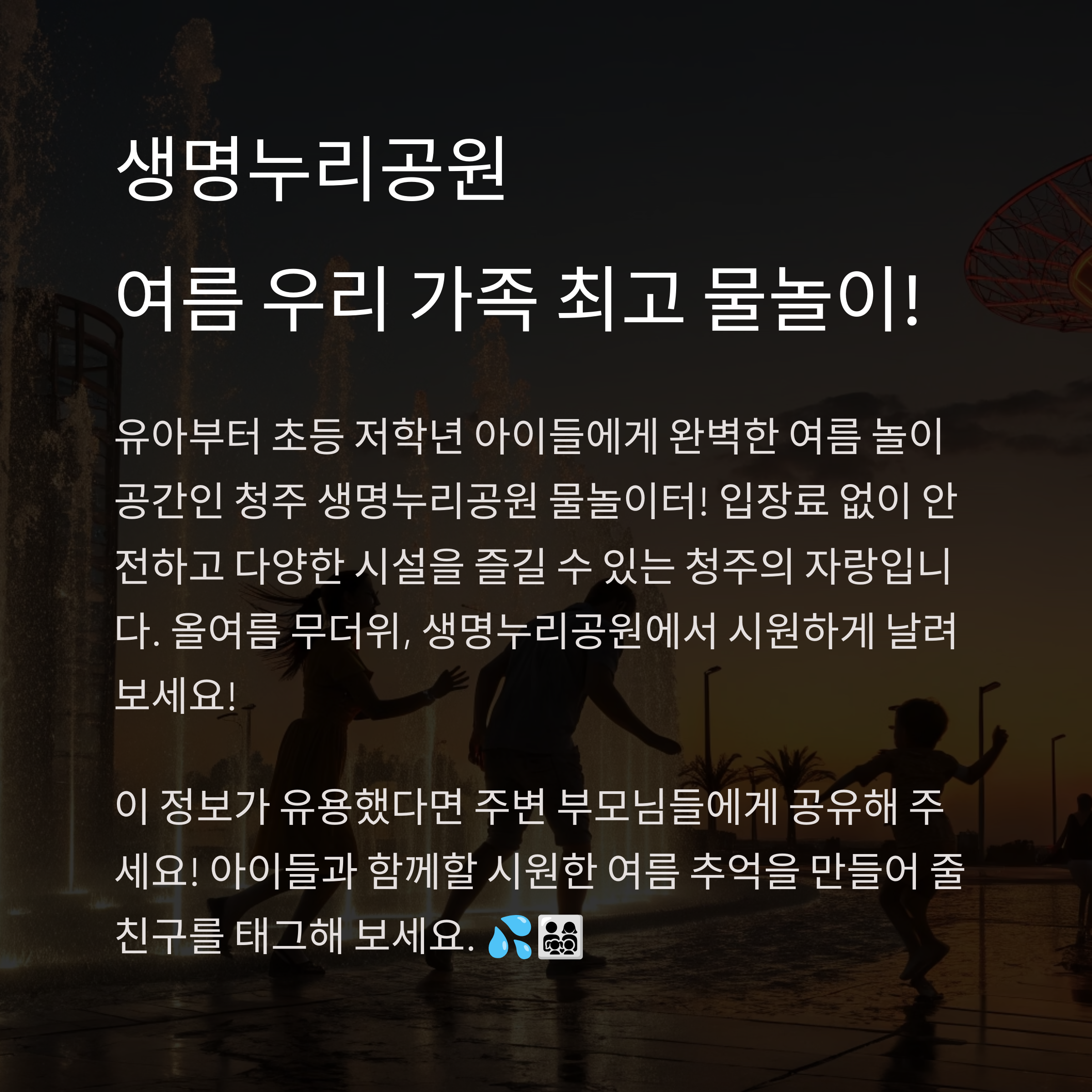 청주 생명누리공원 물놀이터는 충북 청주시 청원구 주중동 514에 위치한 넓은 도심 속 공원 안에 조성된 무료 입장 물놀이 공간입니다. 2025년 여름 시즌(6월~8월 중순)에 운영되며, 기상 조건 따라 조기 종료될 수 있으니 방문 전 운영 여부 확인이 필요합니다.