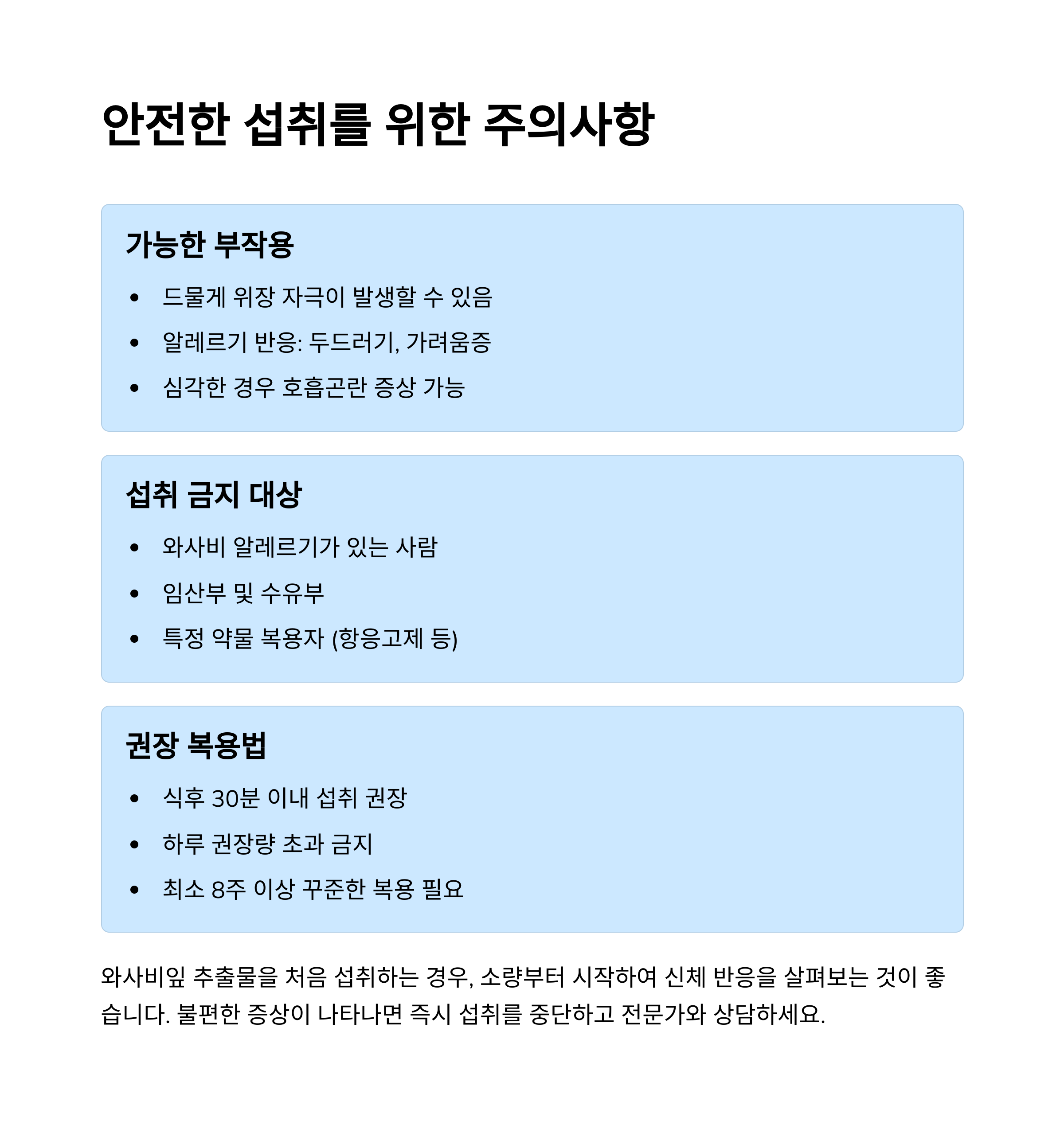 와사비잎은 천연 성분이라도, 인체에 자극을 줄 수 있는 매운맛 성분과 항균 물질이 포함돼 있어 특정 체질에는 부작용이 있을 수 있습니다. 안전하게 섭취하기 위해 아래 사항을 꼭 확인하세요.