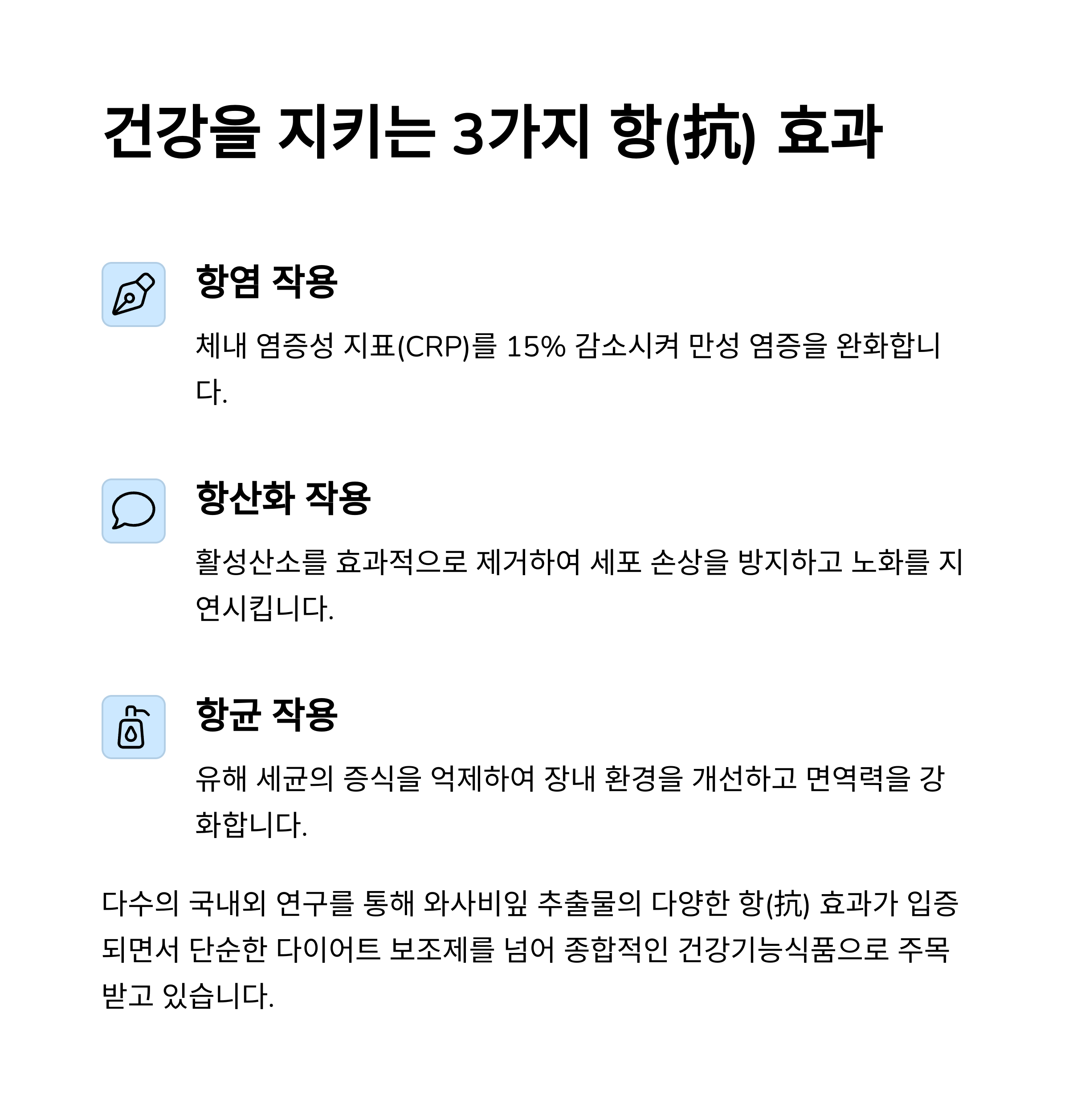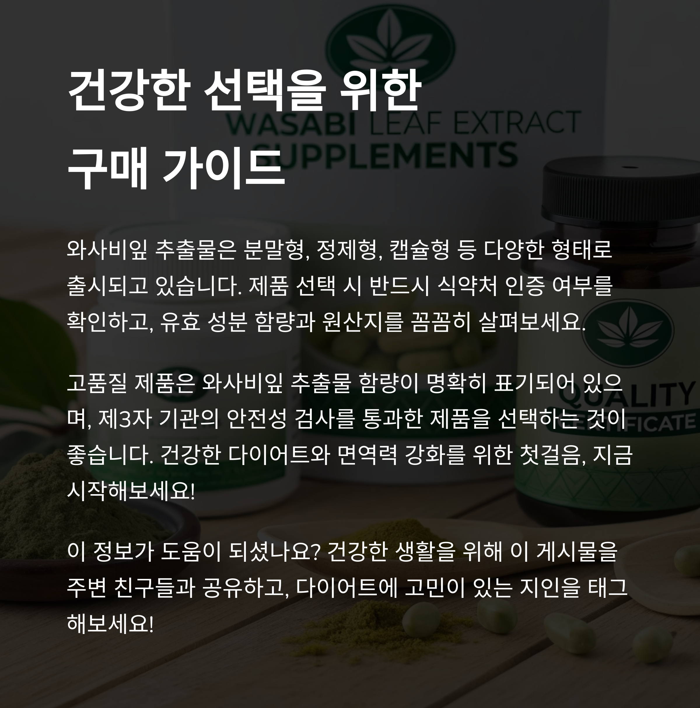 체지방 관리와 면역 건강, 이 두 가지를 동시에 잡고 싶다면 와사비잎 추출물은 주목할 만한 선택입니다. 단순한 유행 소재가 아니라, 실제 인체시험을 통해 기능성과 안정성을 입증받은 성분이라는 점에서 차별화됩니다. 꾸준한 섭취와 함께 식단, 수면, 운동까지 병행한다면 일상 속 건강 회복의 시작점이 되어줄 수 있죠. 단, 체질에 따라 반응이 다를 수 있으니 전문가 상담을 거친 후 섭취하시는 것을 권장드립니다. 건강은 한 번에 바뀌지 않지만, 오늘의 작은 선택이 내일의 큰 변화로 이어질 수 있습니다.