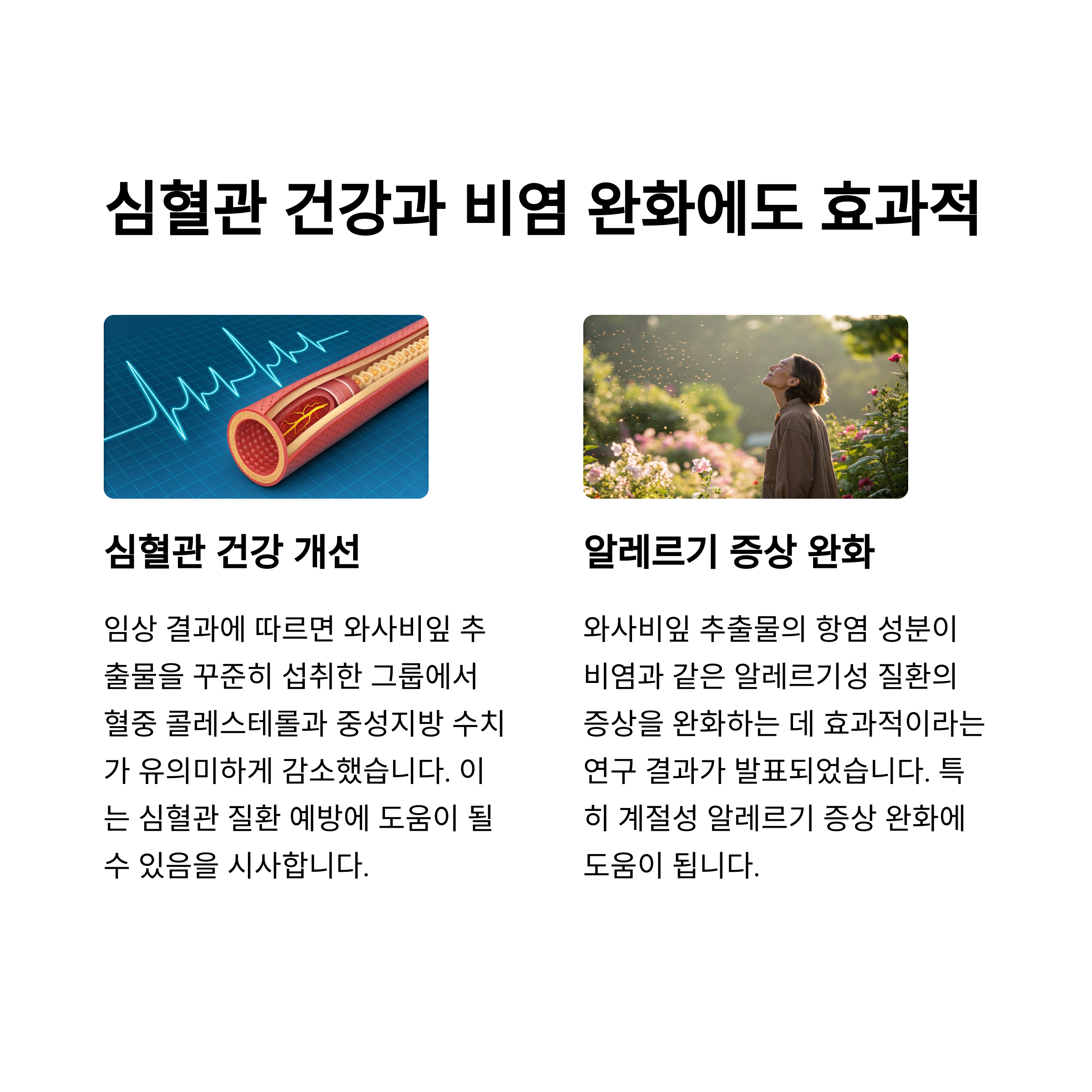 다수의 건강 프로그램과 연구 자료에 따르면, 와사비잎 추출물은 단순한 식이섬유나 해독제가 아닌 기능성 개별인정형 소재로, 다음과 같은 효능이 임상적으로 검증되었습니다.