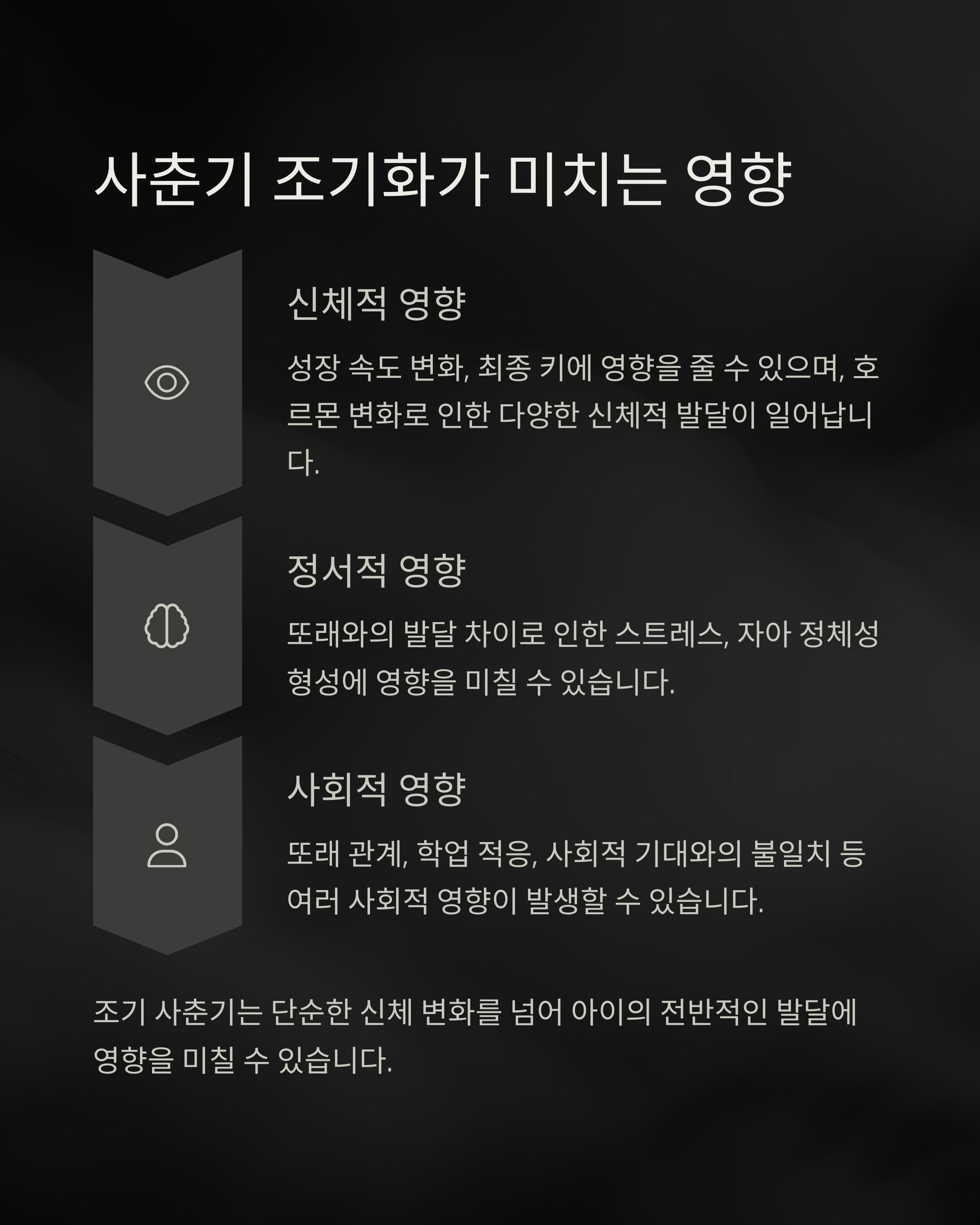 조기 사춘기는 성장판이 빨리 닫히거나 심리적으로 불안감을 초래할 수 있어요. 의심된다면 전문가와 상담을 권합니다.