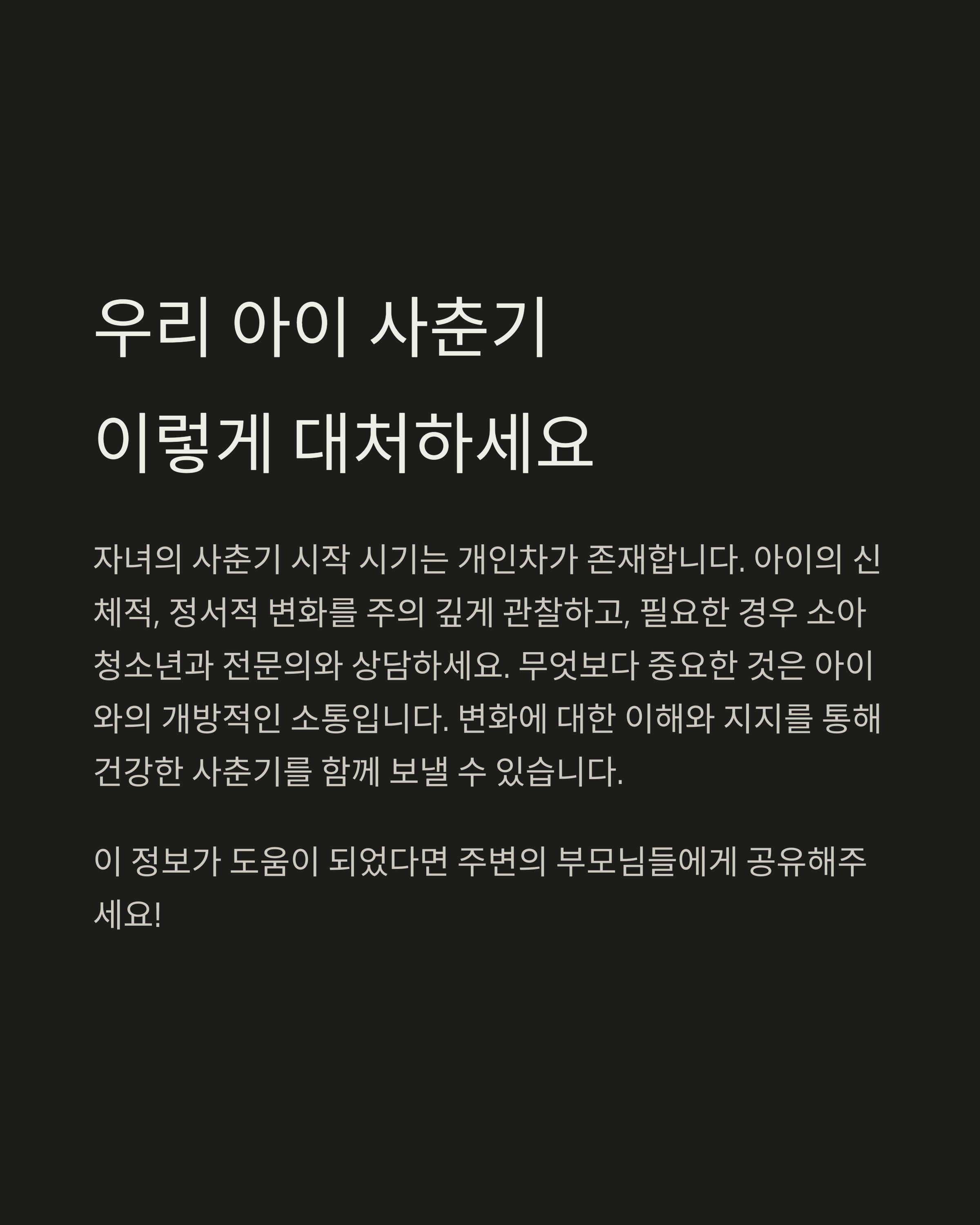 사춘기, 누구에게나 찾아오는 성장의 시기지만, 부모로서 아이의 작은 변화 하나하나에 민감해질 수밖에 없죠. 그럴 때일수록 우리도 한 발 물러서서 아이의 입장에서 바라보는 여유가 필요하지 않을까요? 빠르거나 느리거나, 정답은 없어요. 중요한 건 그 순간을 함께해주는 어른의 존재랍니다. 오늘 이 글이 누군가에게 작은 위로와 힌트가 되길 바라며, 여러분의 아이도 건강한 사춘기를 보내길 진심으로 응원할게요.