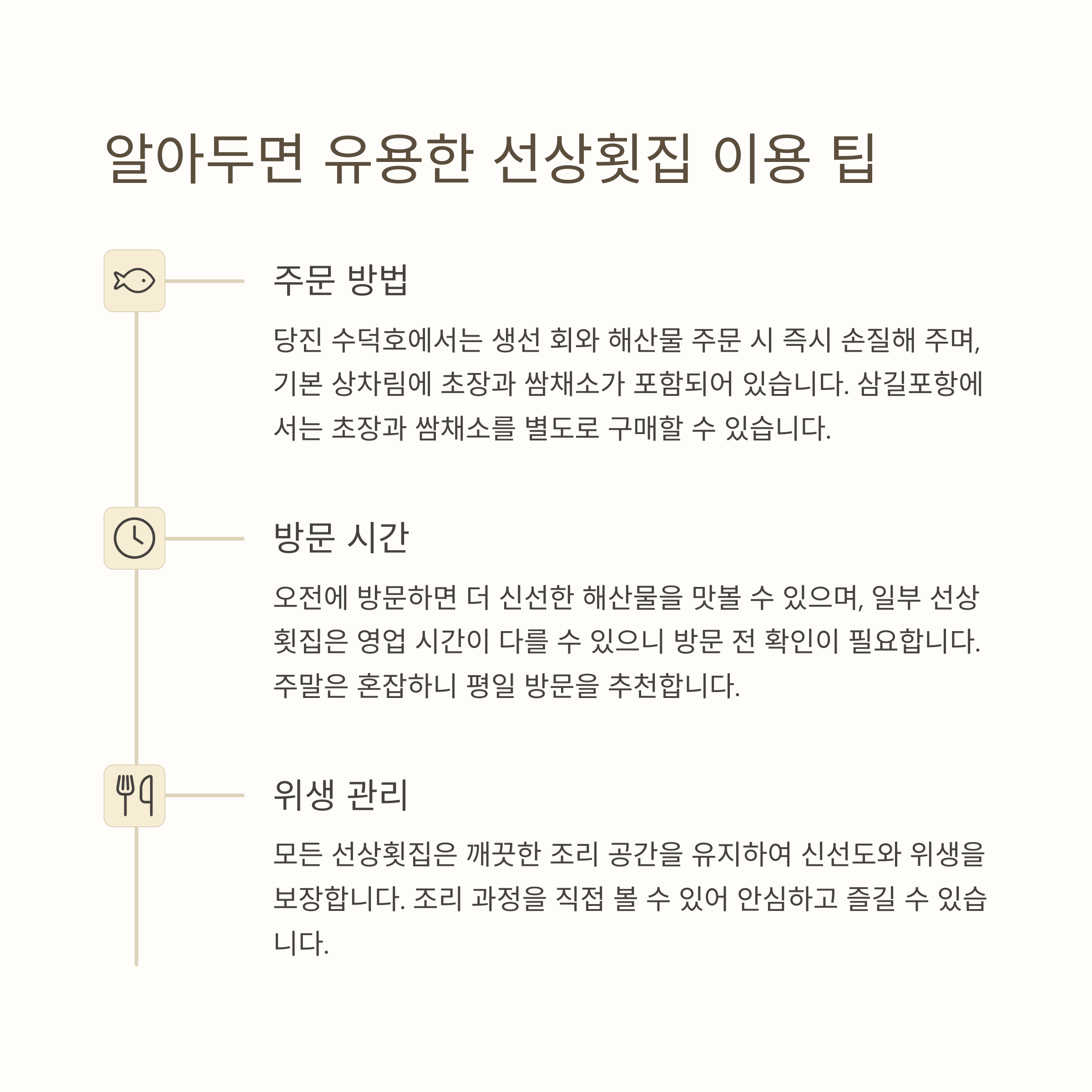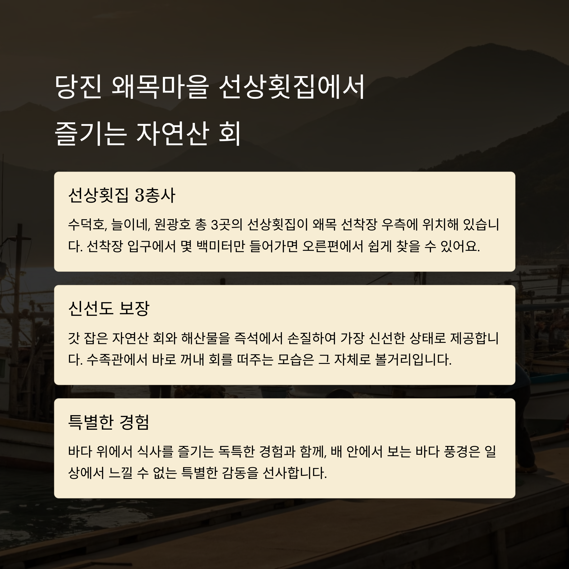 - 선상횟집은 주말 오전 시간에 붐비므로 조기 방문 추천